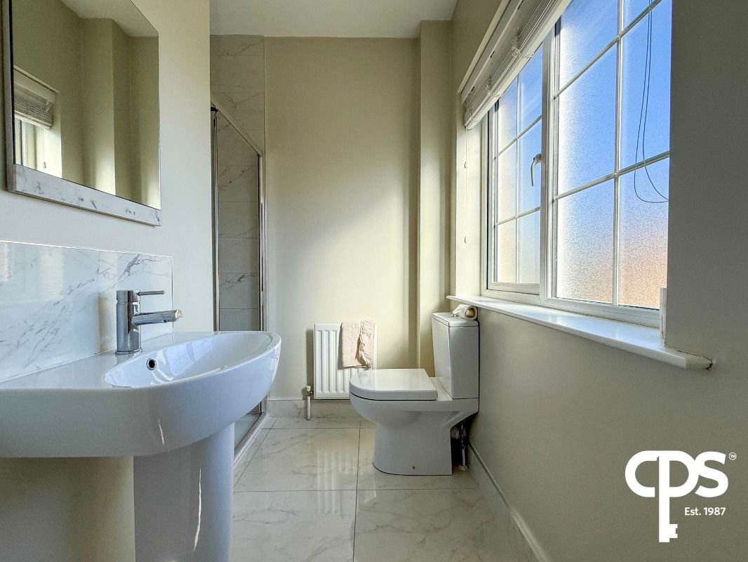 Modern three-piece suite comprising W/C, wash hand basin, and walk-in power shower. Upgraded tiled floor and tiled skirting.