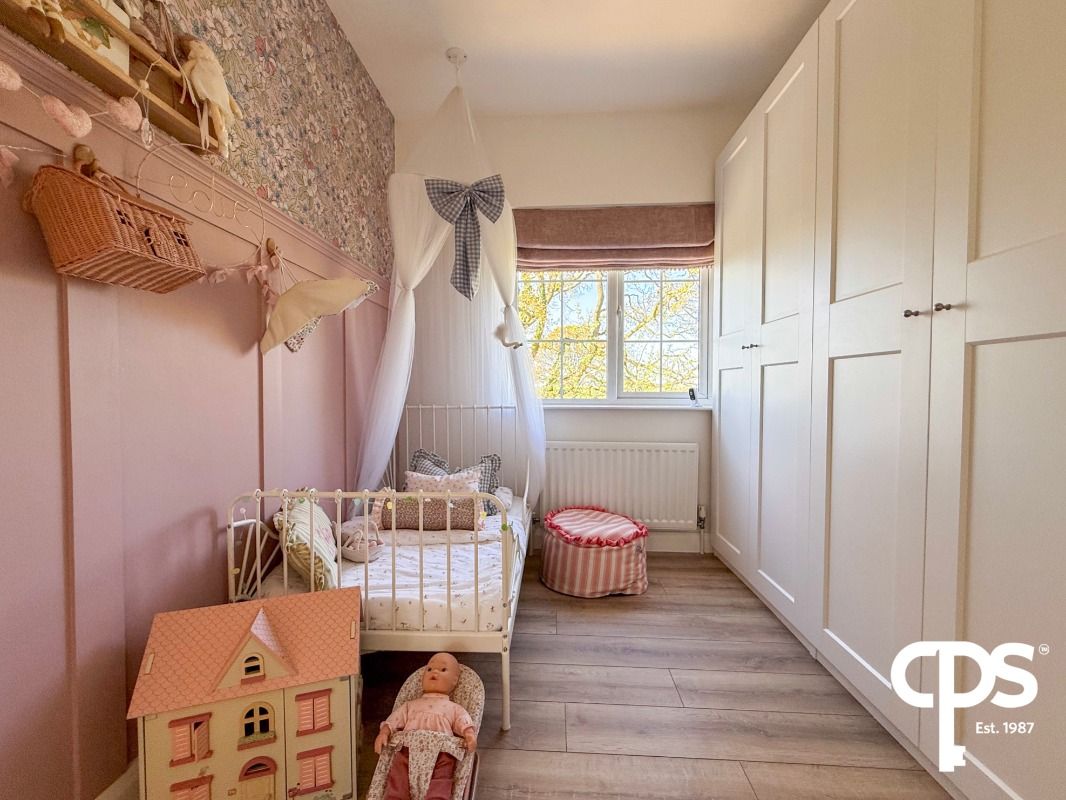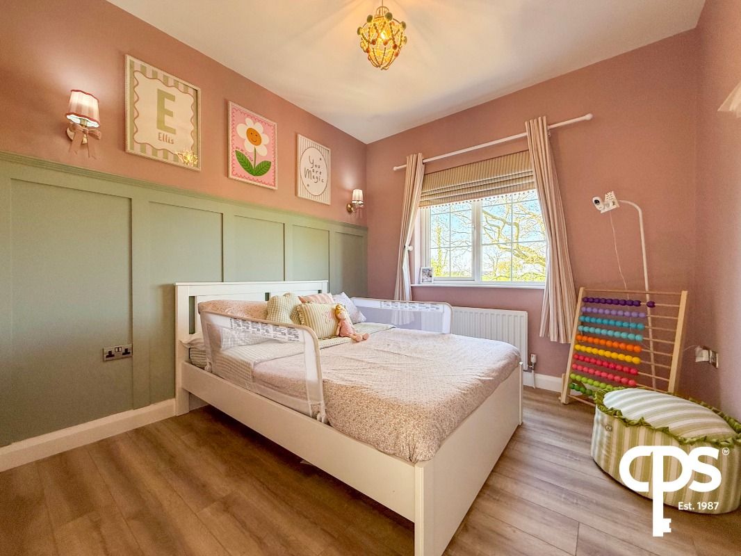 Rear-facing double bedroom with wood-effect flooring and panelling to one wall.
