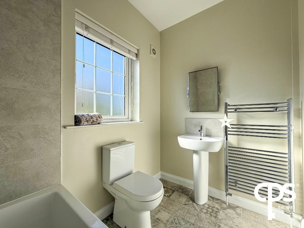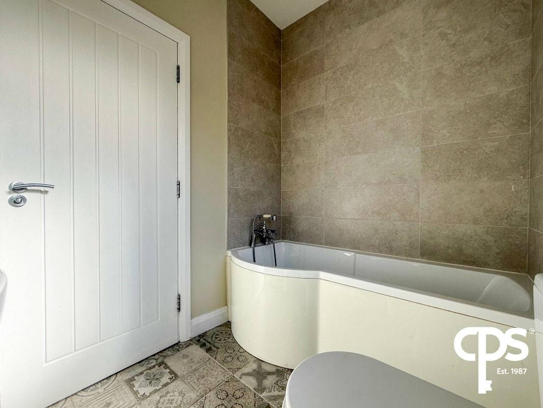 Fitted with a modern three-piece suite including bath, W/C, and wash hand basin with feature tiled flooring.