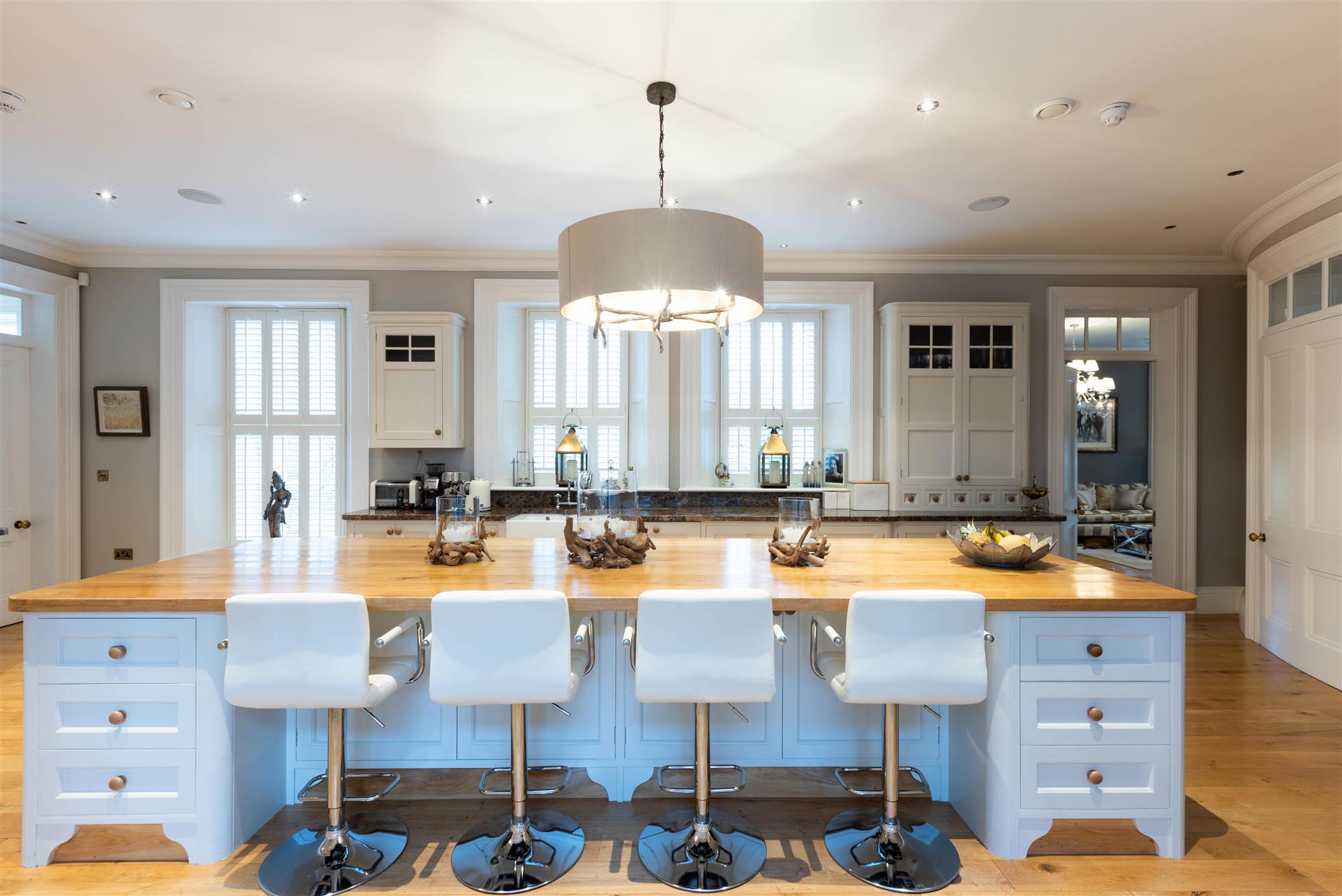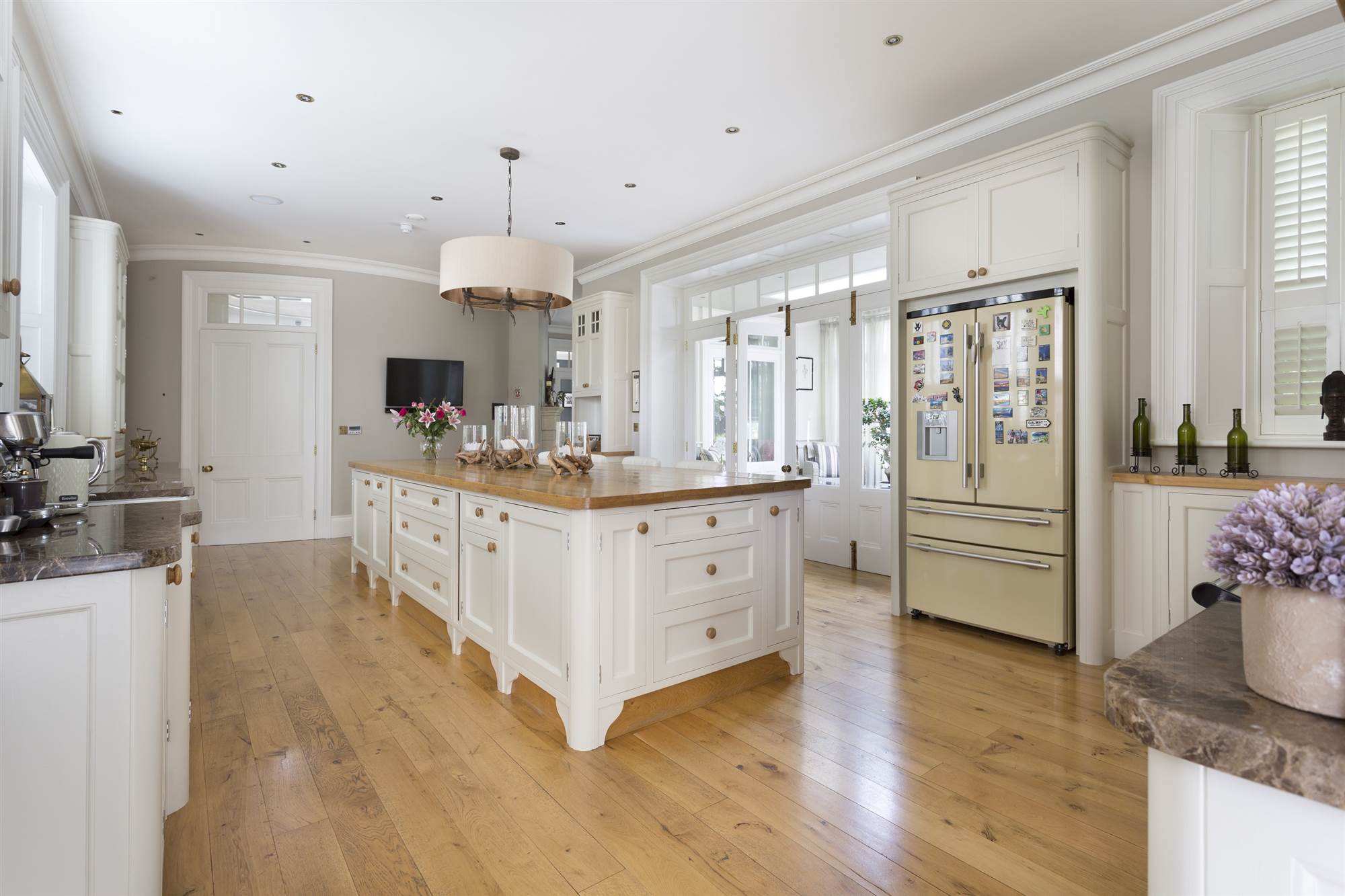 Excellent range of high and low level handcrafted units with central island unit. Solid oak work tops. Breakfast bar area. Aga range. Fridge/freezer and dishwasher. Inset sink. Emperador marble work tops. Walk-in pantry. Corniced ceiling. Recessed lighting. Solid oak flooring. Double doors to: