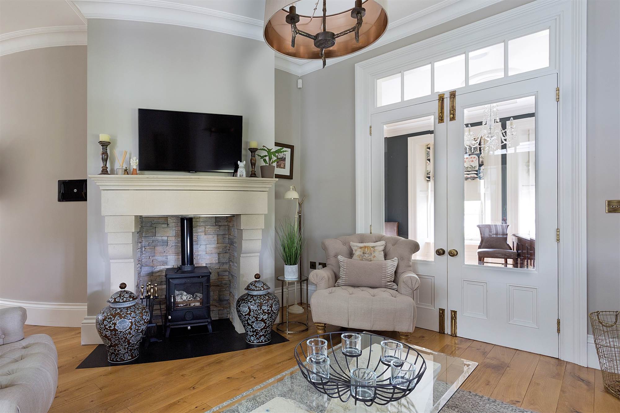 Attractive feature sandstone fireplace with multi-fuel burning stove. Tiled hearth. Solid oak flooring. Corniced ceiling. Double doors to: