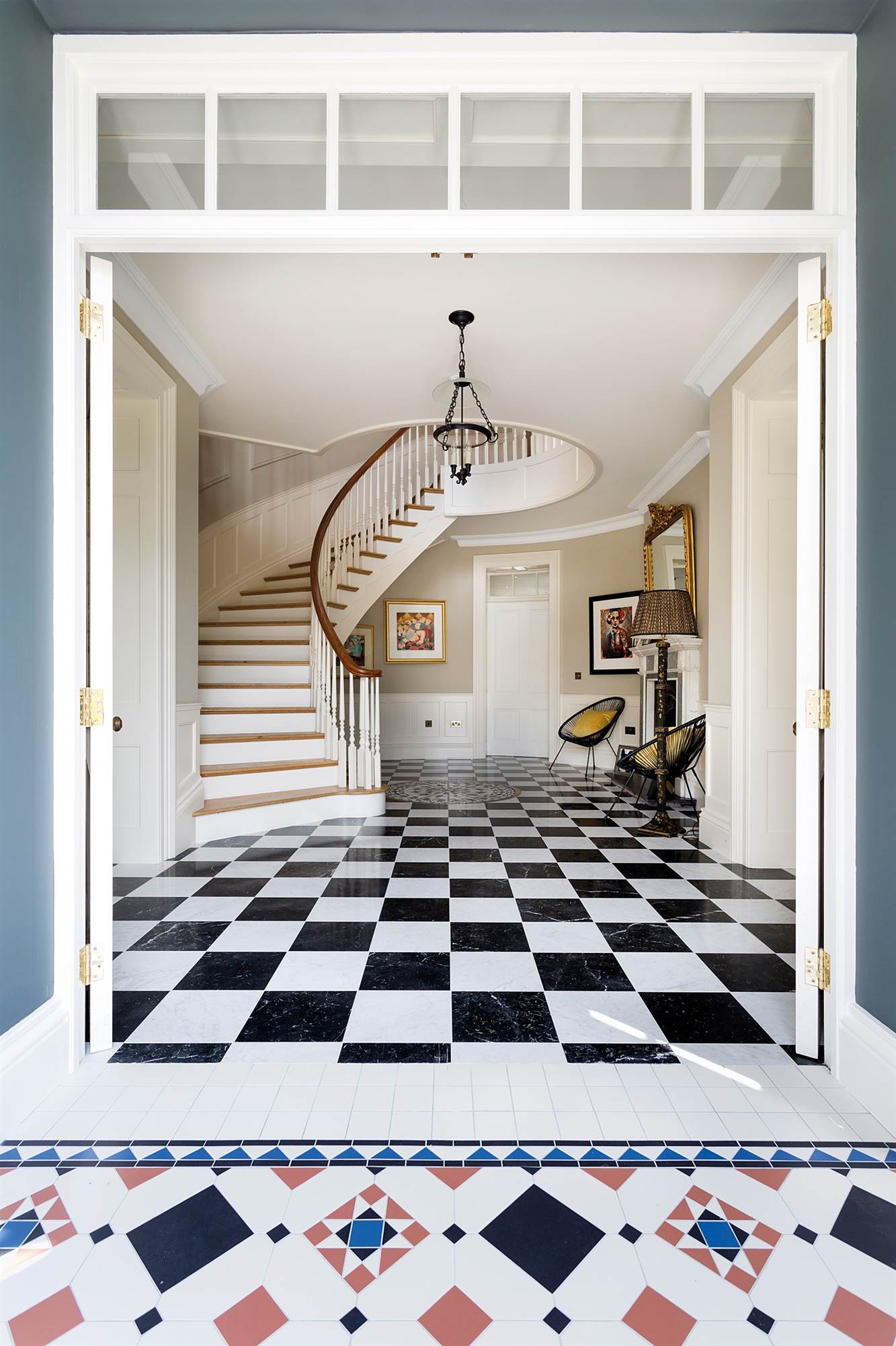 Hardwood door with glazed side panels and fanlight to: