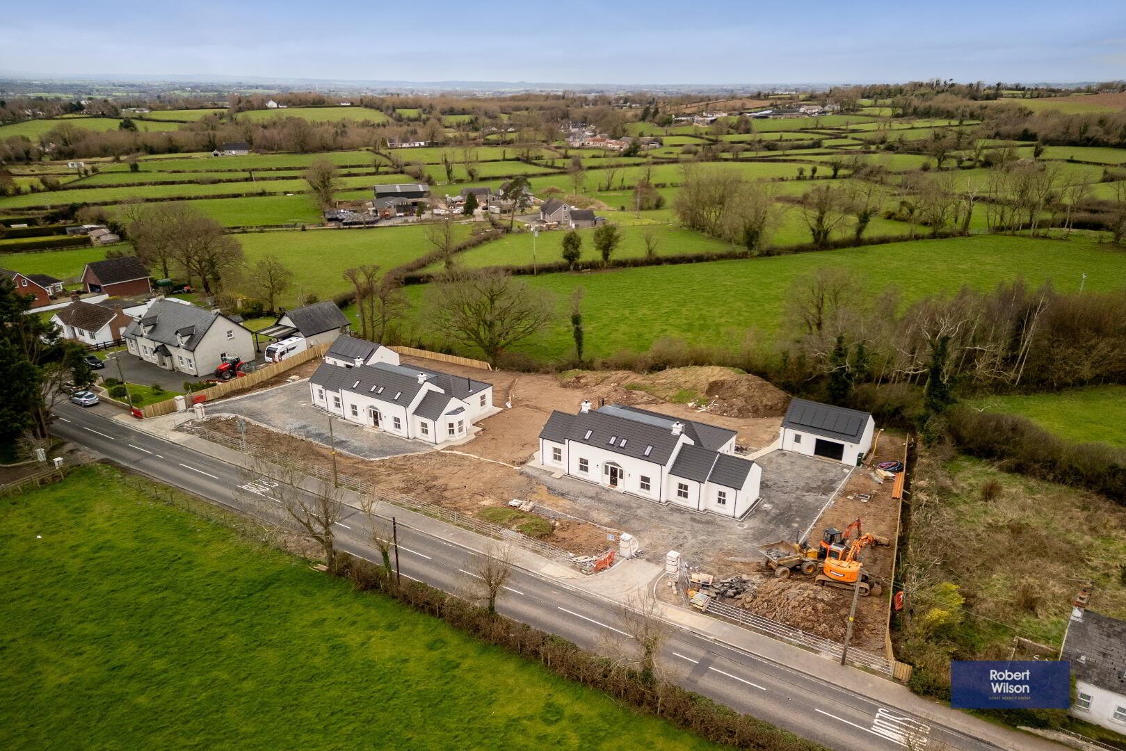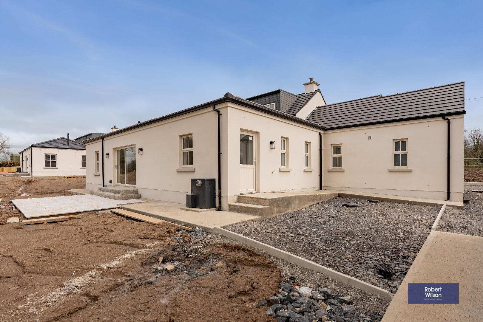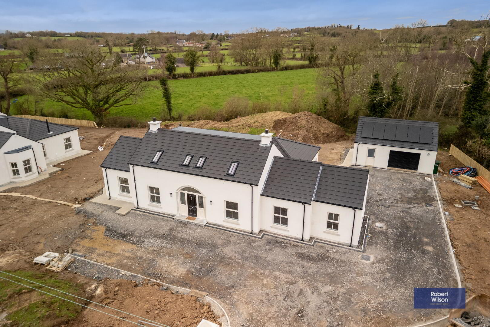Nestled in a beautiful semi-rural setting between Lurgan and Gilford, these two stunning new-build chalet-style bungalows offer spacious, modern living finished to an exceptional specification. Designed with both style and practicality in mind, the homes extend to generous five-bedroom accommodation and enjoy picturesque open countryside views to the rear. The heart of each home is the impressive open-plan living, kitchen and dining area, complete with a central island and a cosy multi-fuel stove—perfect for both everyday family life and entertaining. A separate living room provides additional relaxation space, while the ground floor also benefits from three well-proportioned bedrooms, a utility room, and a convenient downstairs WC. Upstairs, there are 2 double bedrooms, the luxurious master bedroom boasts a walk-in wardrobe and private ensuite. A stylish four-piece family bathroom completes the first floor accommodation. Externally, the properties are equally impressive, with landscaped gardens, a detached garage, and a disabled access ramp from the rear door to the garage. The front entrance features attractive pillars with electrical provision for automated gates should the new owners wish to install them. Cream double-glazed windows, composite front and rear doors, and oil-fired central heating complete these beautiful homes. Finished to a superb standard throughout, these properties truly offer a turnkey opportunity—simply move in and enjoy the space, comfort, and breath-taking countryside views. Ideal for first-time buyers, families seeking room to grow, or anyone looking for modern living in a peaceful yet convenient location. All floors are tiled or have wood effect Laminate fitted, white panelled wooden doors through-out with Hockey Stick architraves, seamless guttering & PVC downspouts....all for low maintenance living.