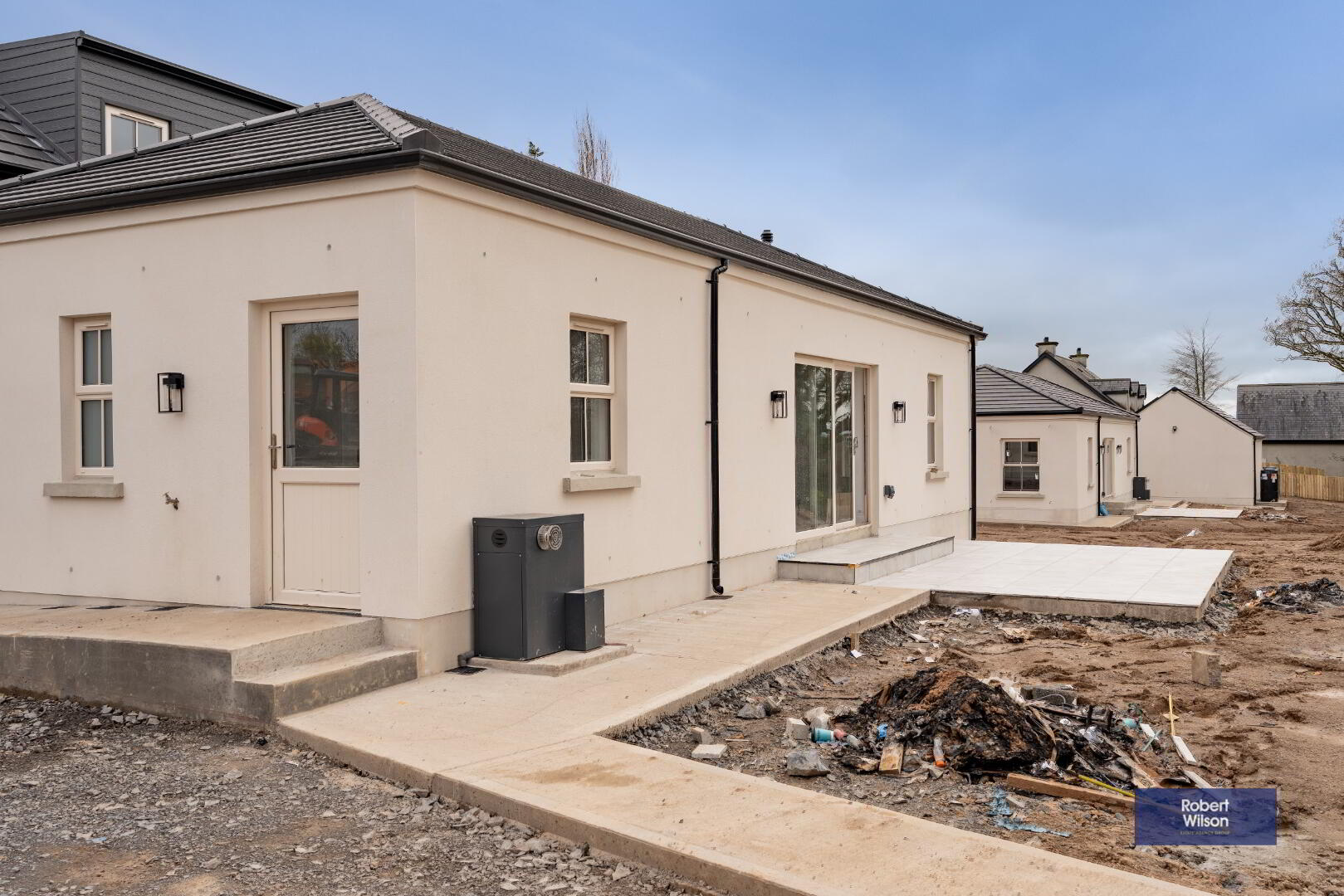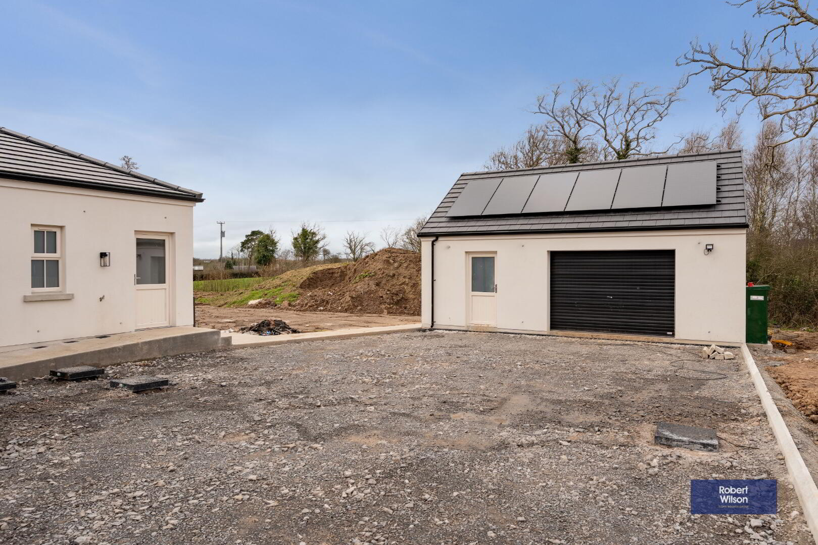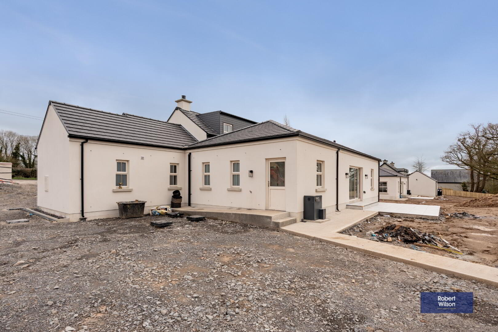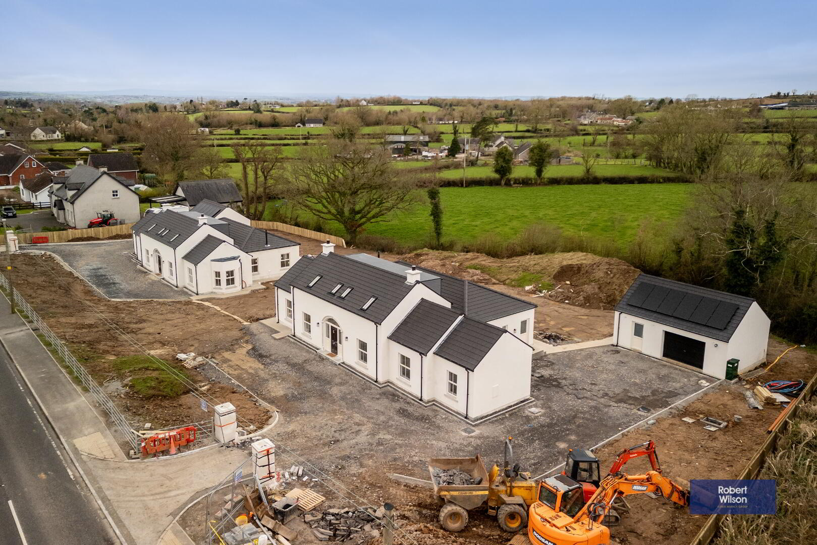 Nestled in a beautiful semi-rural setting between Lurgan and Gilford, these two stunning new-build chalet-style bungalows offer spacious, modern living finished to an exceptional specification. Designed with both style and practicality in mind, the homes extend to generous five-bedroom accommodation and enjoy picturesque open countryside views to the rear. The heart of each home is the impressive open-plan living, kitchen and dining area, complete with a central island and a cosy multi-fuel stove—perfect for both everyday family life and entertaining. A separate living room provides additional relaxation space, while the ground floor also benefits from three well-proportioned bedrooms, a utility room, and a convenient downstairs WC. Upstairs, there are 2 double bedrooms, the luxurious master bedroom boasts a walk-in wardrobe and private ensuite. A stylish four-piece family bathroom completes the first floor accommodation. Externally, the properties are equally impressive, with landscaped gardens, a detached garage, and a disabled access ramp from the rear door to the garage. The front entrance features attractive pillars with electrical provision for automated gates should the new owners wish to install them. Cream double-glazed windows, composite front and rear doors, and oil-fired central heating complete these beautiful homes. Finished to a superb standard throughout, these properties truly offer a turnkey opportunity—simply move in and enjoy the space, comfort, and breath-taking countryside views. Ideal for first-time buyers, families seeking room to grow, or anyone looking for modern living in a peaceful yet convenient location. All floors are tiled or have wood effect Laminate fitted, white panelled wooden doors through-out with Hockey Stick architraves, seamless guttering & PVC downspouts....all for low maintenance living.