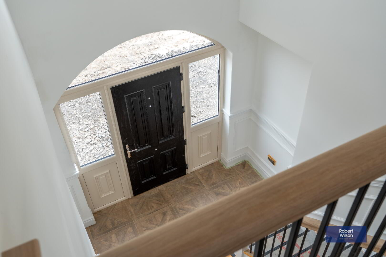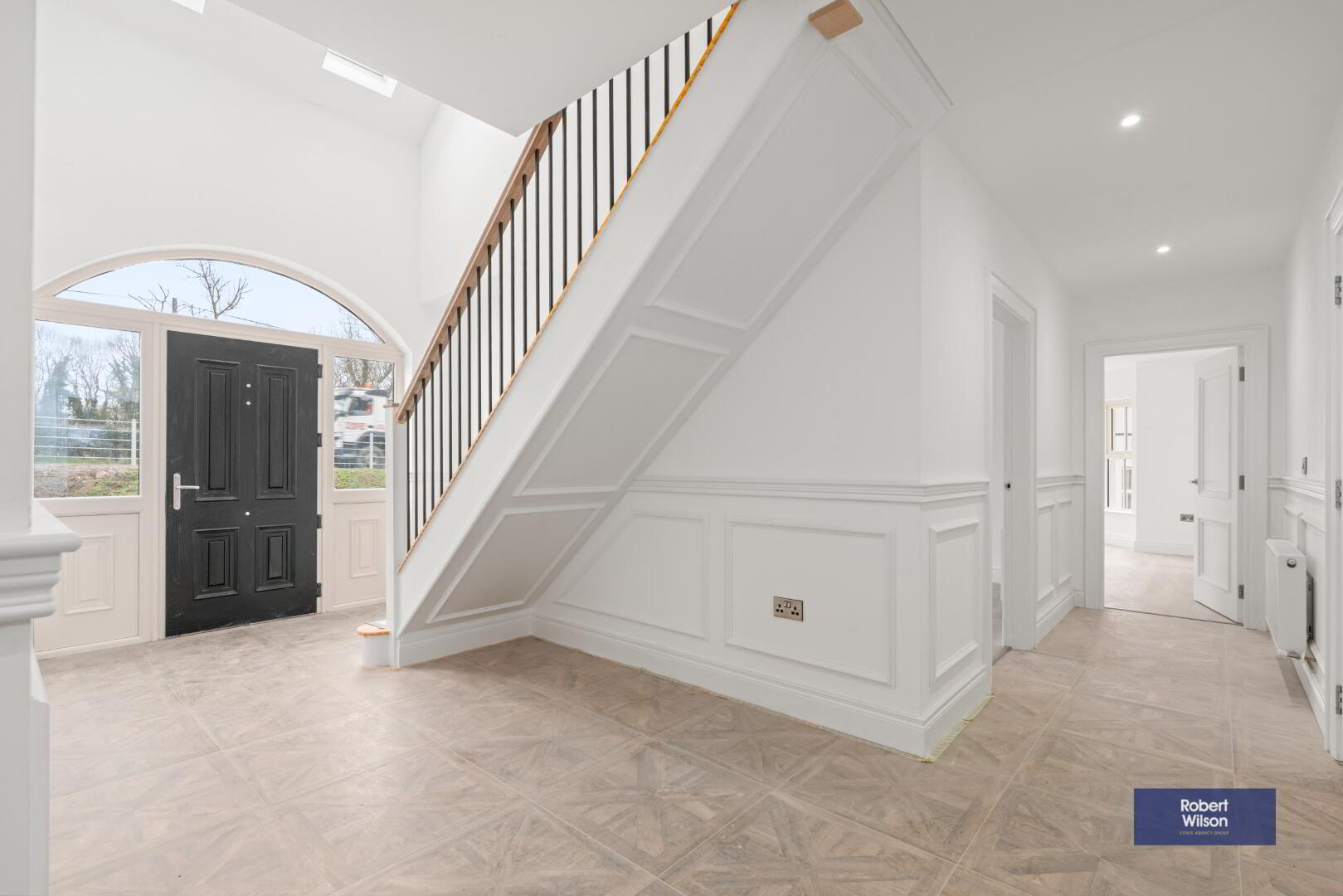 Granite tiled step to Composite front door, with 2 side lights. Parquet effect tiled flooring, half panelled walls, metal balustrades with Oak handrail, Oak tread stairs, recessed lighting, 2 radiators, store room housing pressurised water system.