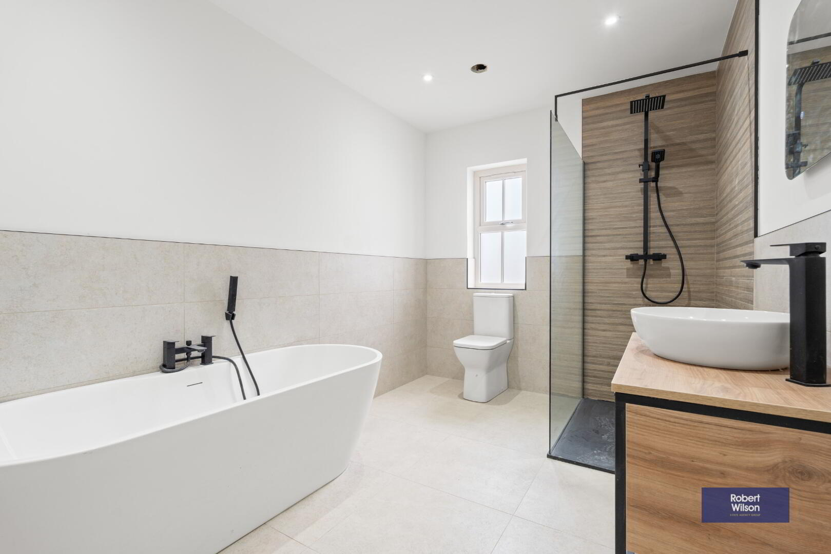 4 piece white suite comprising, low flush WC, free standing bath, vanity unit incorporating wash hand basin with vanity mirror over, walk in shower cubicle with slate floor & wood effect tiled walls, rainfall shower, part tiled walls, tiled floor, recess lighting, black heated towel rail, black fittings..