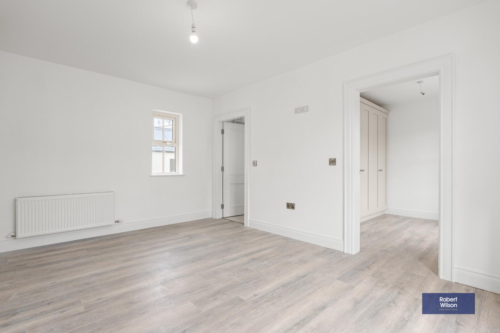 4.65m x 3.46m (15' 3" x 11' 4") Wood laminate flooring, facilities for wall mounted TV. Walk-in dressing room with fitted robes, radiator.