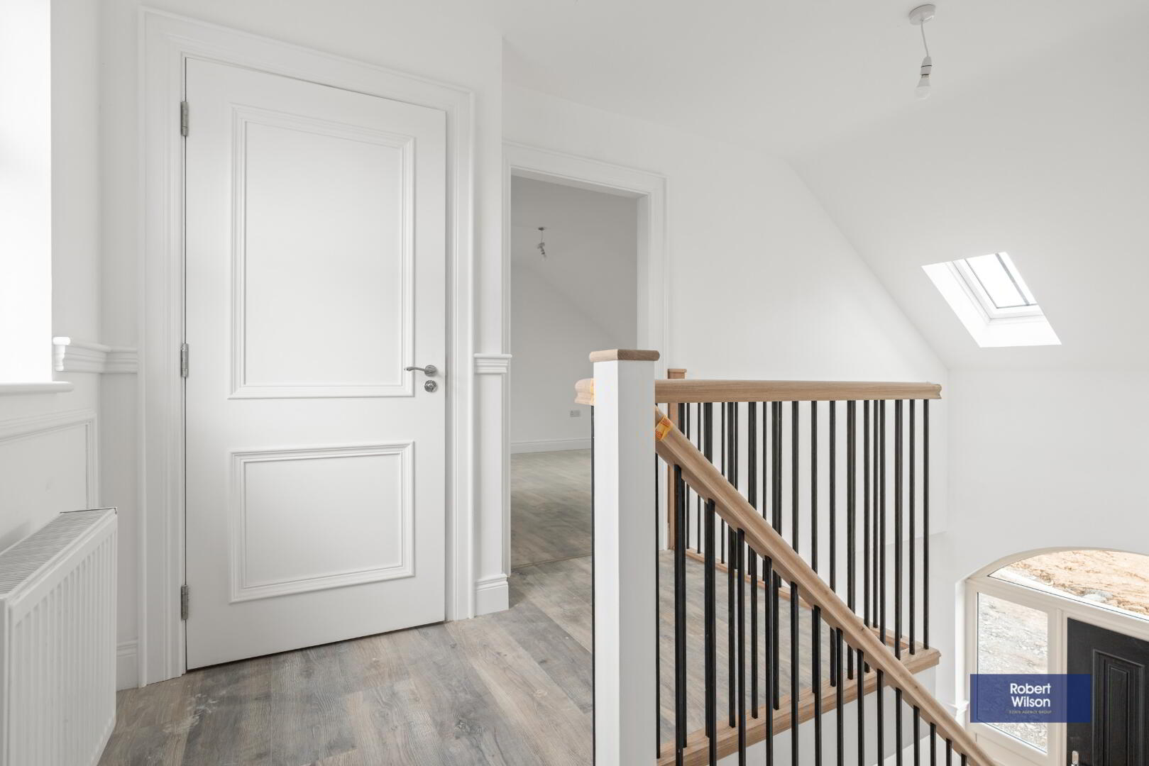Balcony style landing with 2 "Keylite" windows, half panelled walls, radiator, wood laminate flooring.