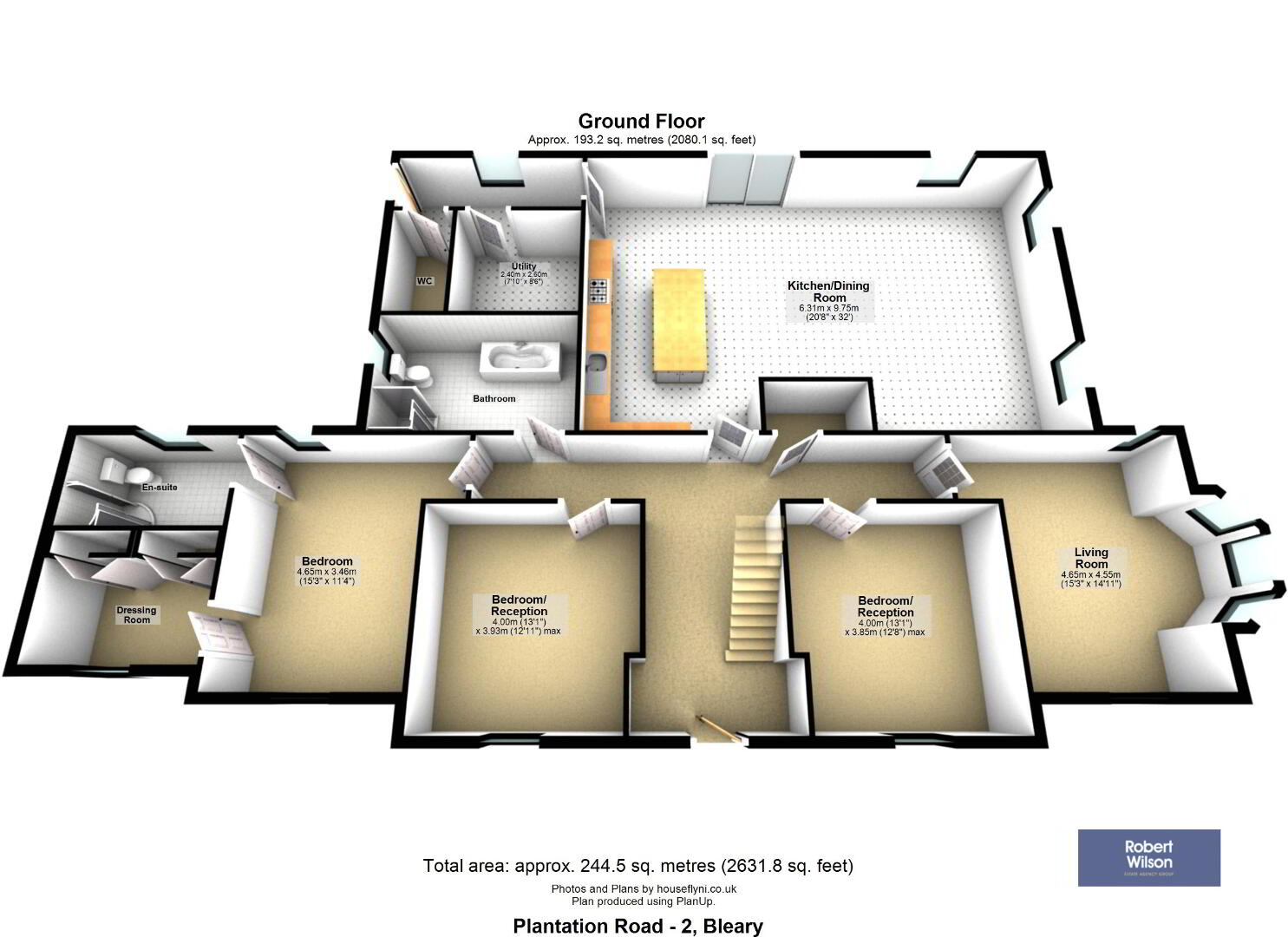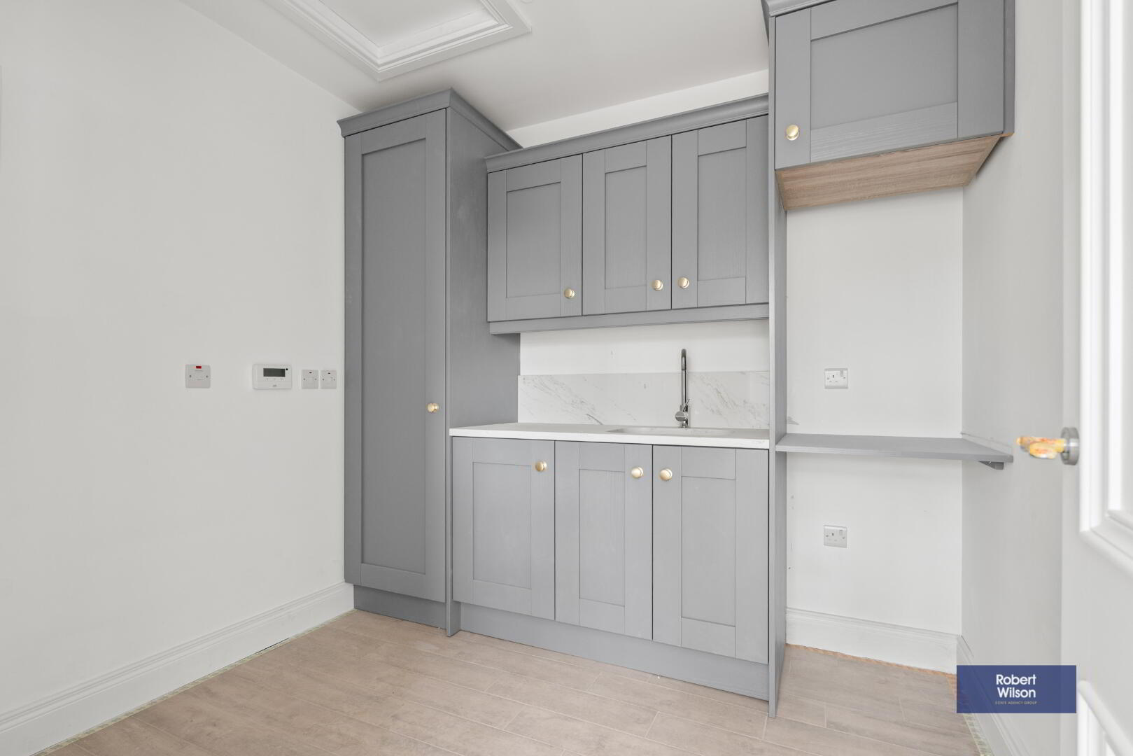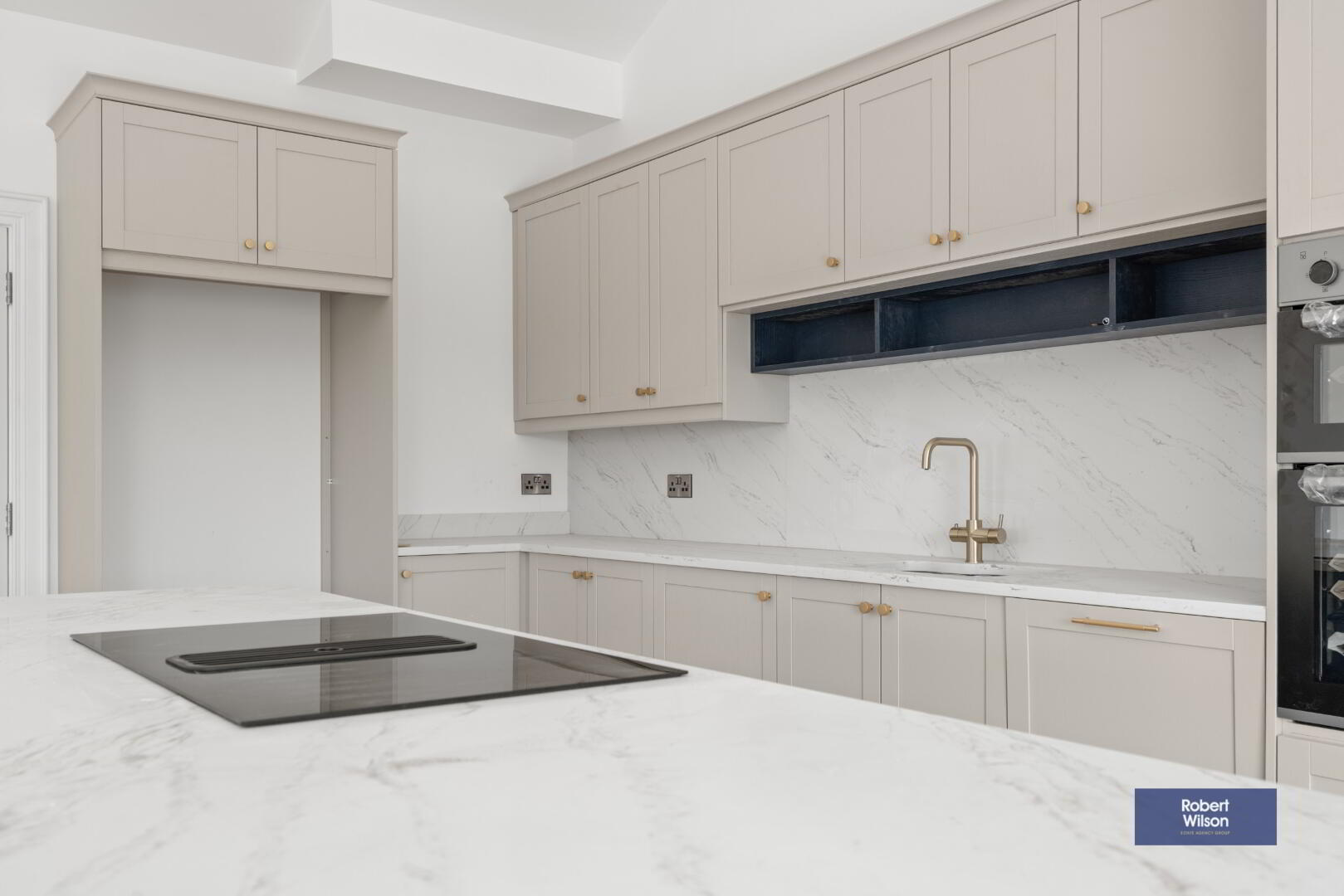 6.31m x 9.75m (20' 8" x 32' 0") Range of high & low shaker style kitchen with 5 piece doors in "Taupe" & larder, Space for American fridge freezer, integrated eye level double oven, wine cooler & dishwasher, "Quartz" worktops & upstands, stainless steel 1.5 sink unit with boiling water facilities. Centre island in Indigo with "Quartz" worktop housing an Induction hob with built in extractor fan, below storage units & space for seating area, 3 radiators, recess lighting, multifuel stove set on a slate hearth, Parquet effect tiled flooring, double patio doors to rear.