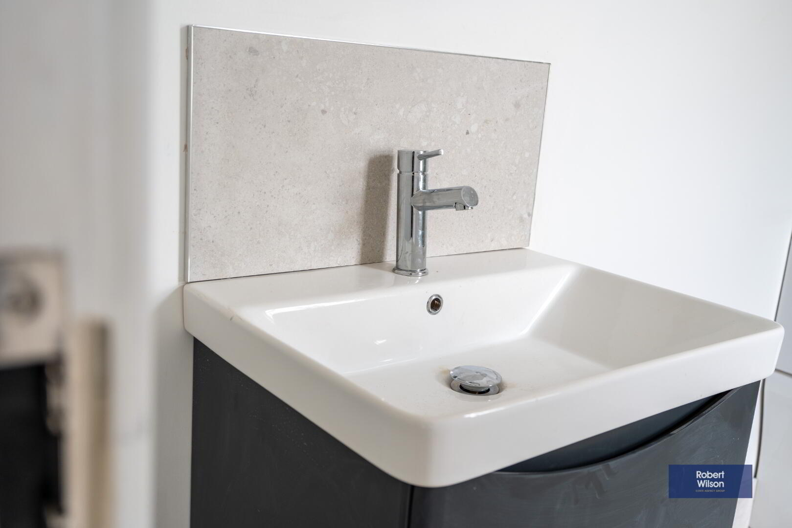 2 piece white suite comprising, low flush WC, vanity unit incorporating wash hand basin, chrome heated towel rail, wood effect tile flooring.