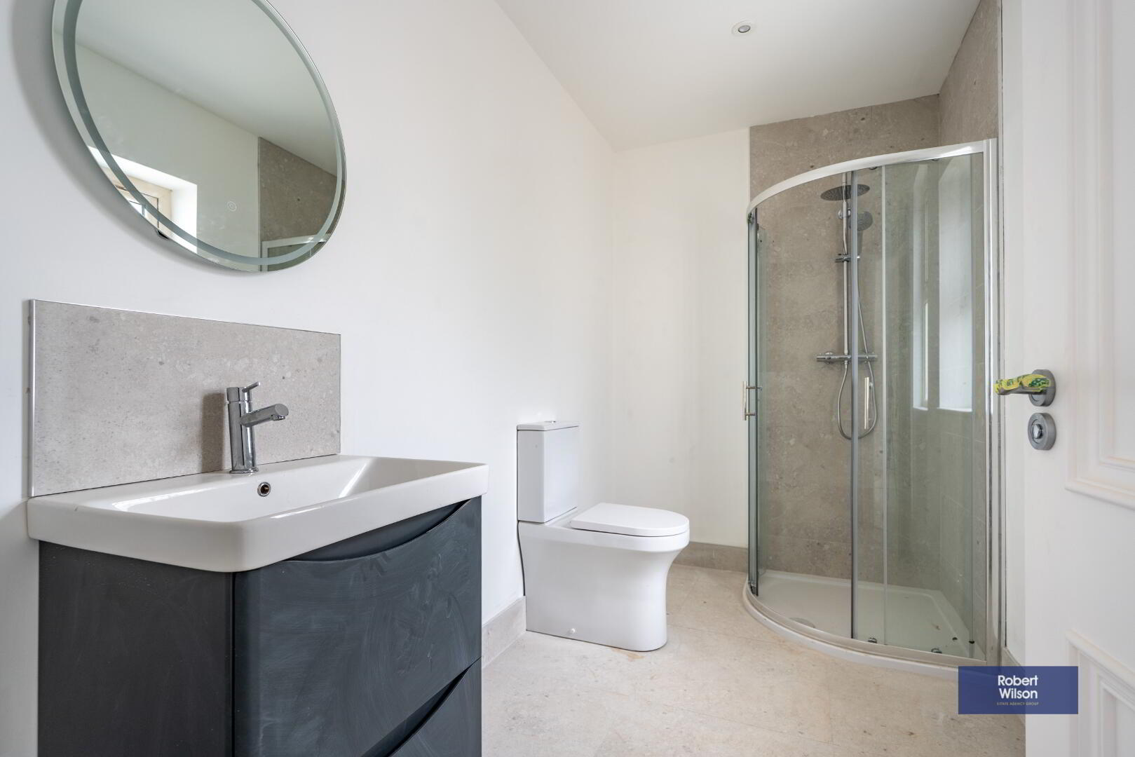 3 piece white suite comprising, low flush WC, vanity unit incorporating wash hand basin with vanity mirror over, walk in shower cubicle with rainfall shower, chrome heated towel rail, recessed lights, stone effect tiled floor, part tiled walls, extractor fan.