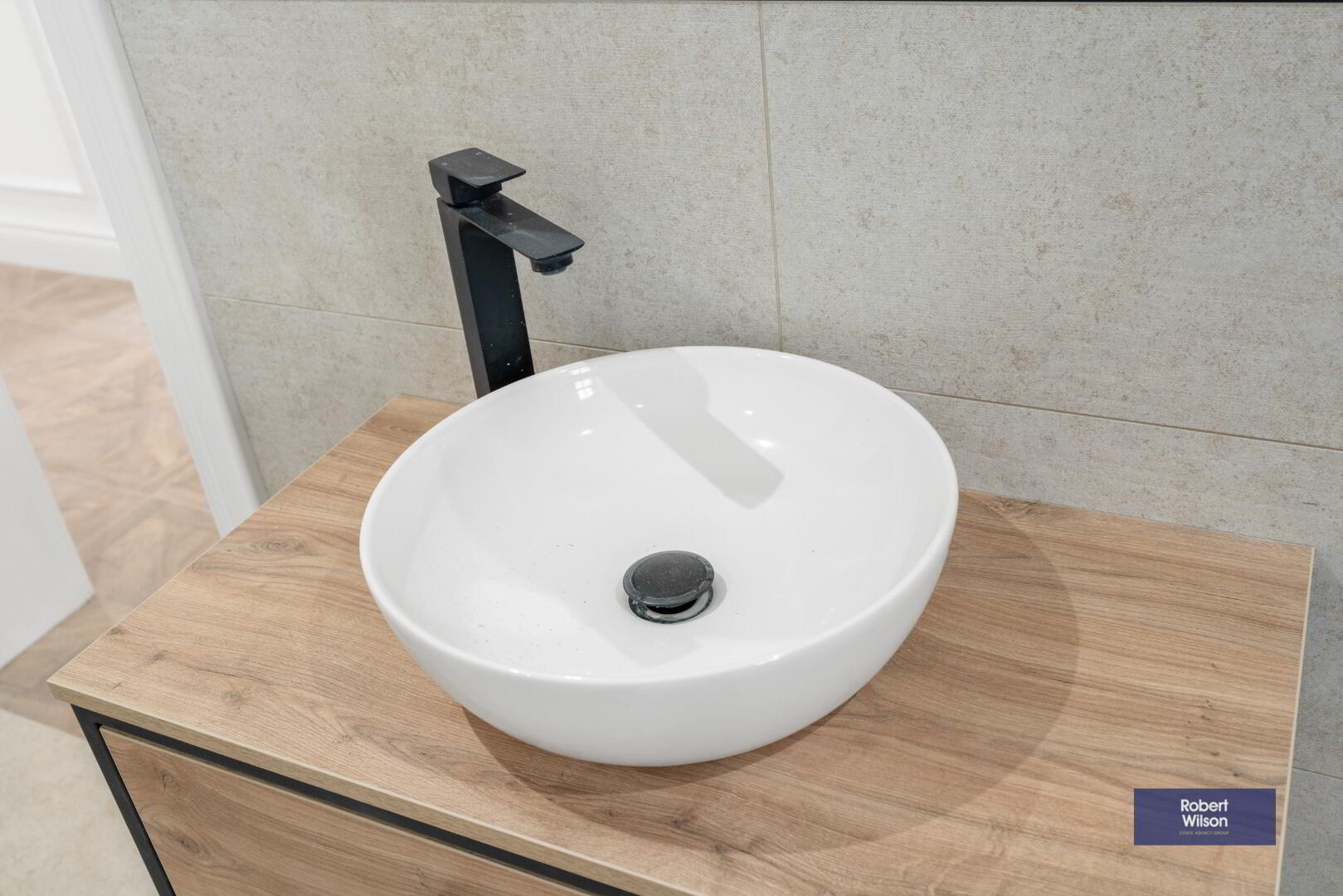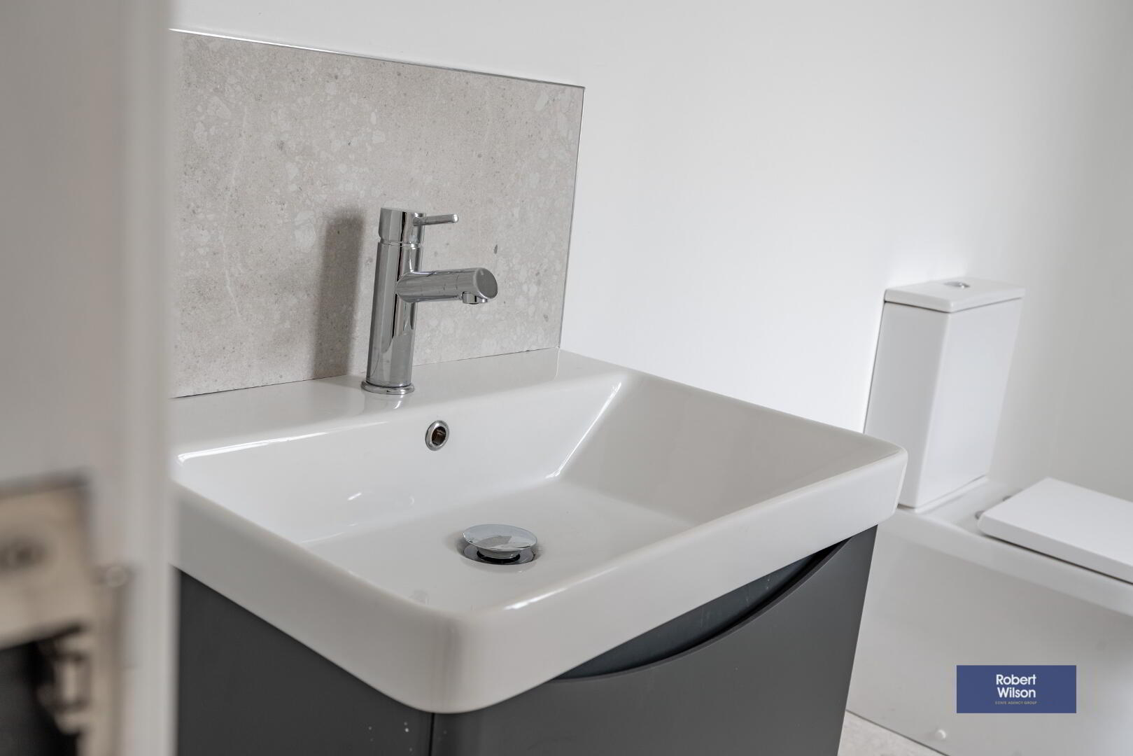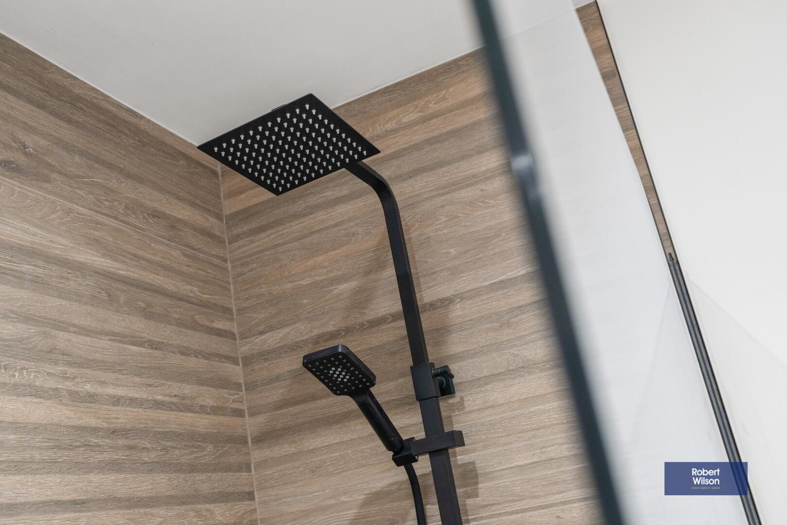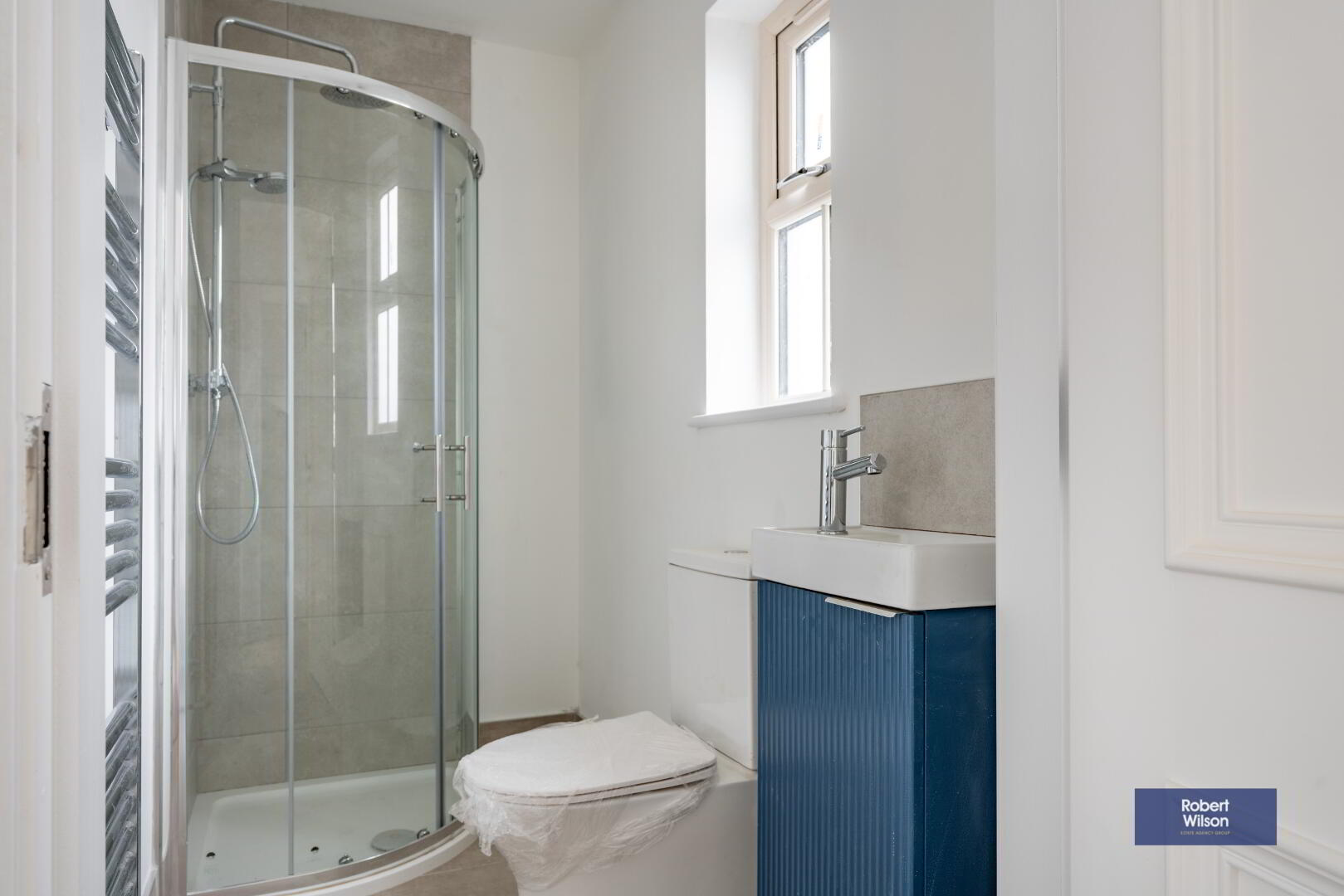 3 piece white suite comprising, low flush WC, vanity unit incorporating wash hand basin, walk in shower cubicle with rainfall shower, chrome heated towel rail, recessed lights, part tiled walls & tiled floor, extractor fan.