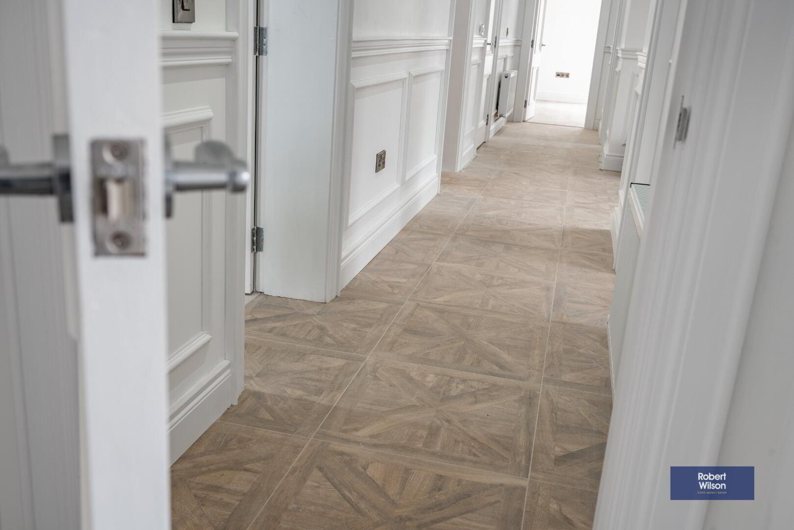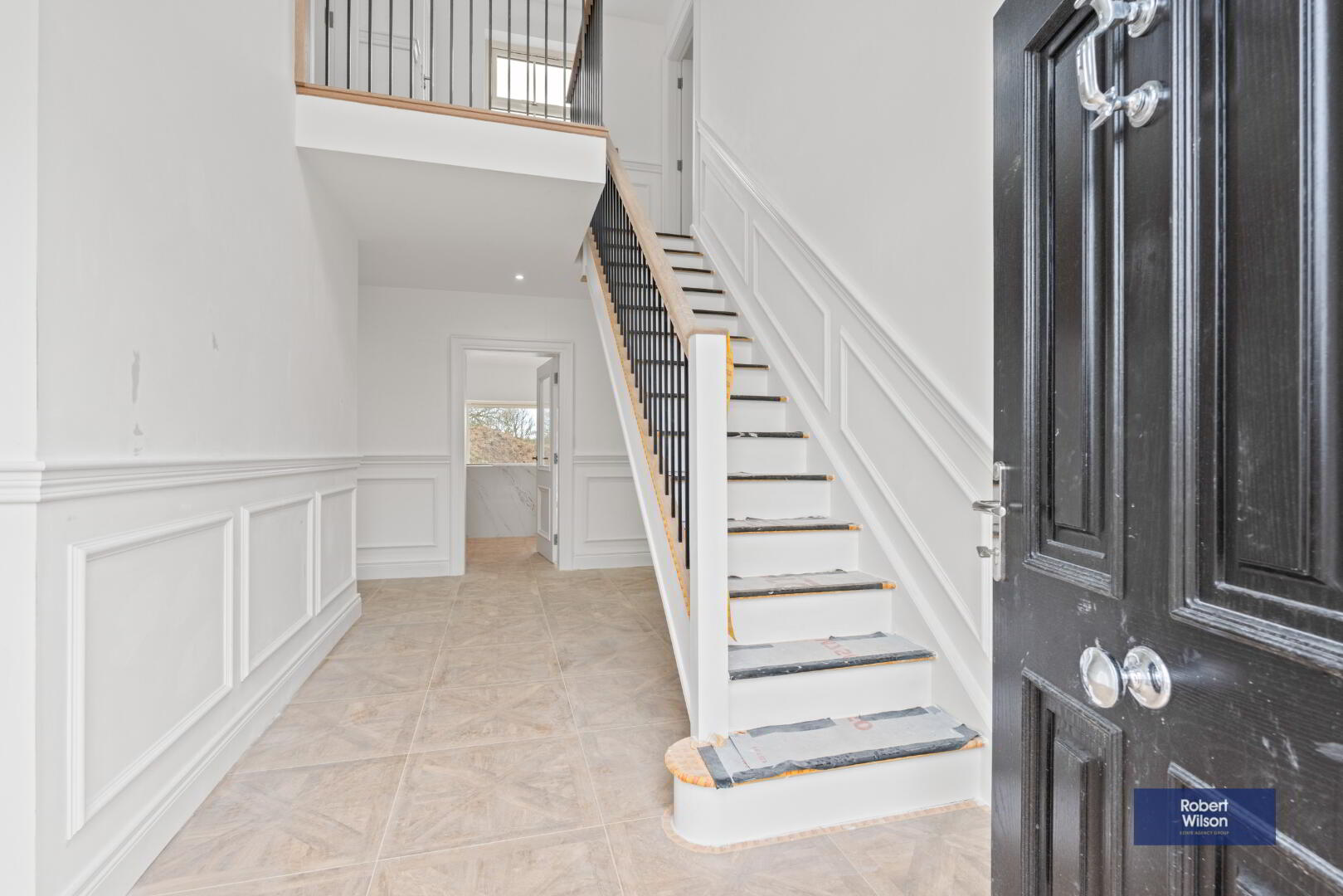 Granite tiled step to Composite front door, with 2 side lights. Parquet effect tiled flooring, half panelled walls, metal balustrades with Oak handrail, Oak tread stairs, recessed lighting, 2 radiators, store room housing pressurised water system.