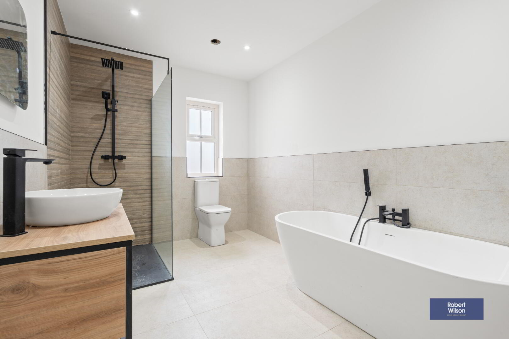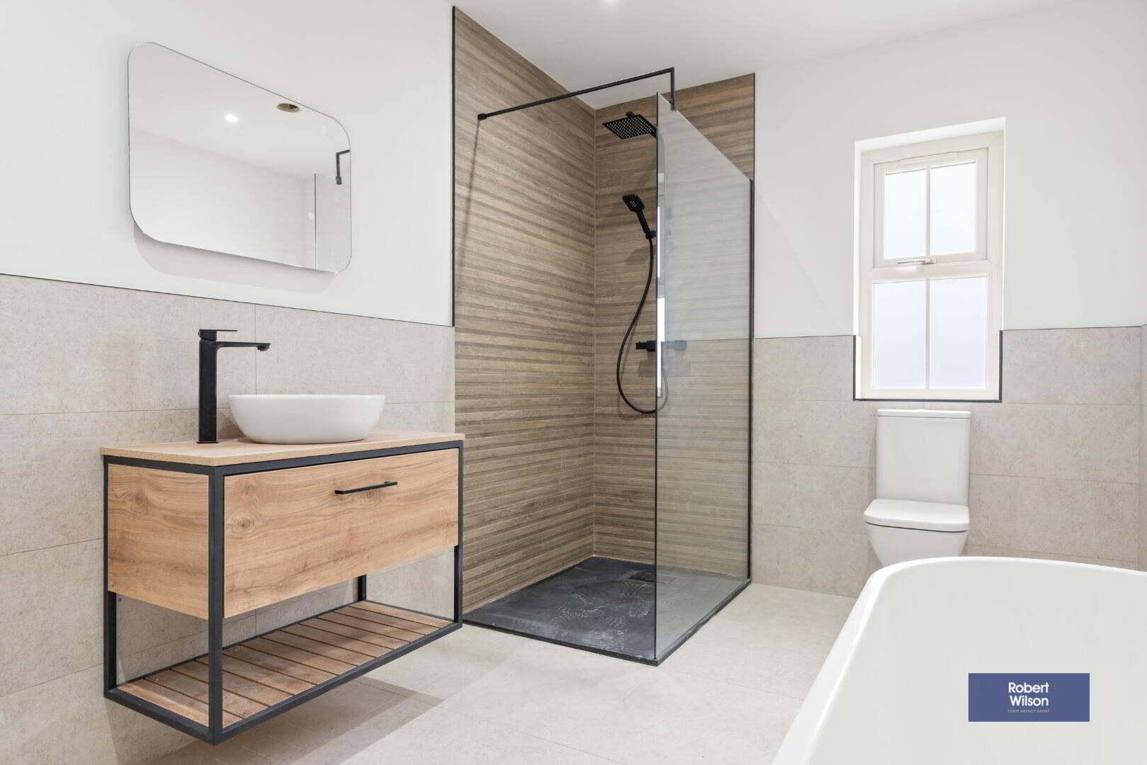 4 piece white suite comprising, low flush WC, free standing bath, vanity unit incorporating wash hand basin with vanity mirror over, walk in shower cubicle with slate floor & wood effect tiled walls, rainfall shower, part tiled walls, tiled floor, recess lighting, black heated towel rail, black fittings.