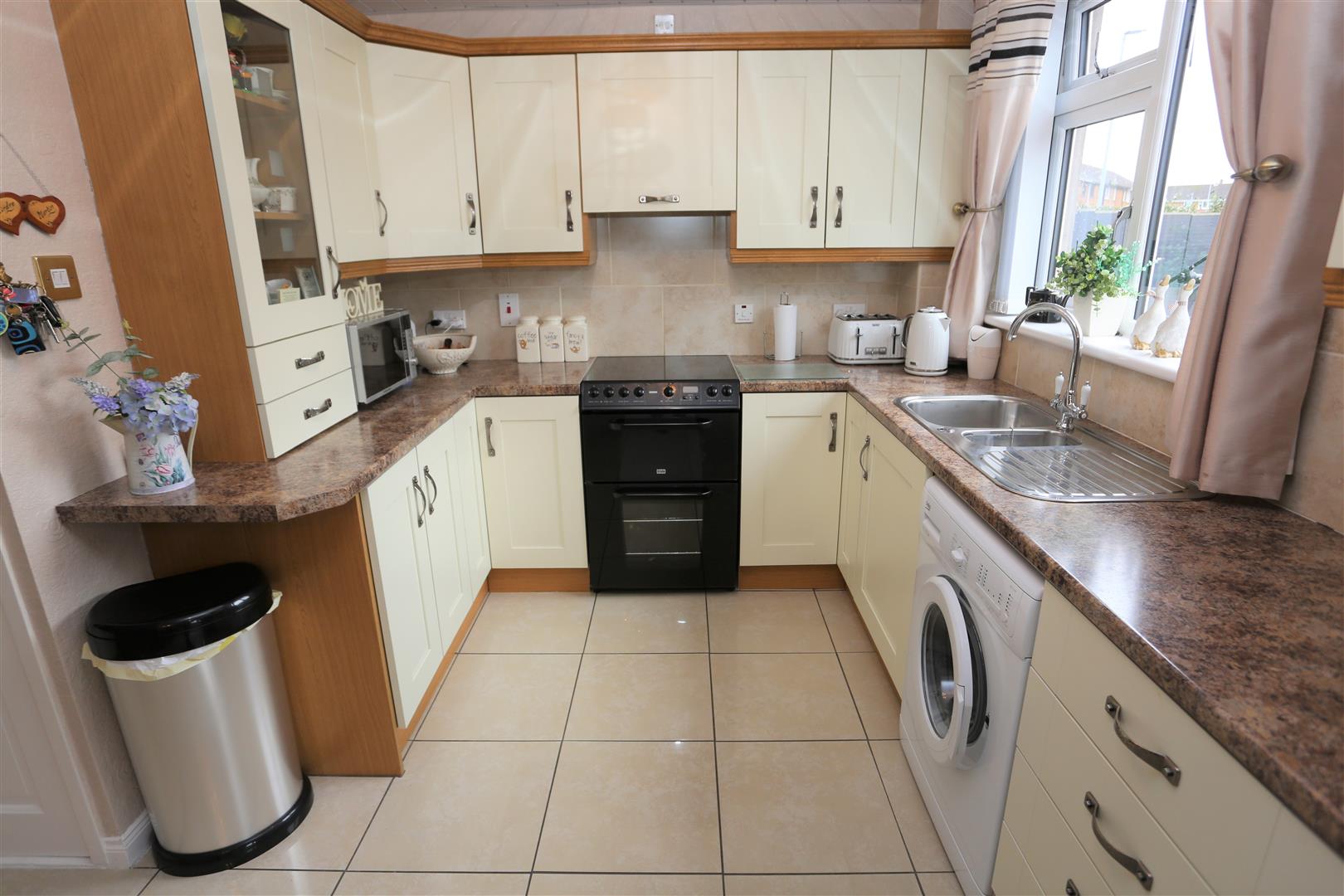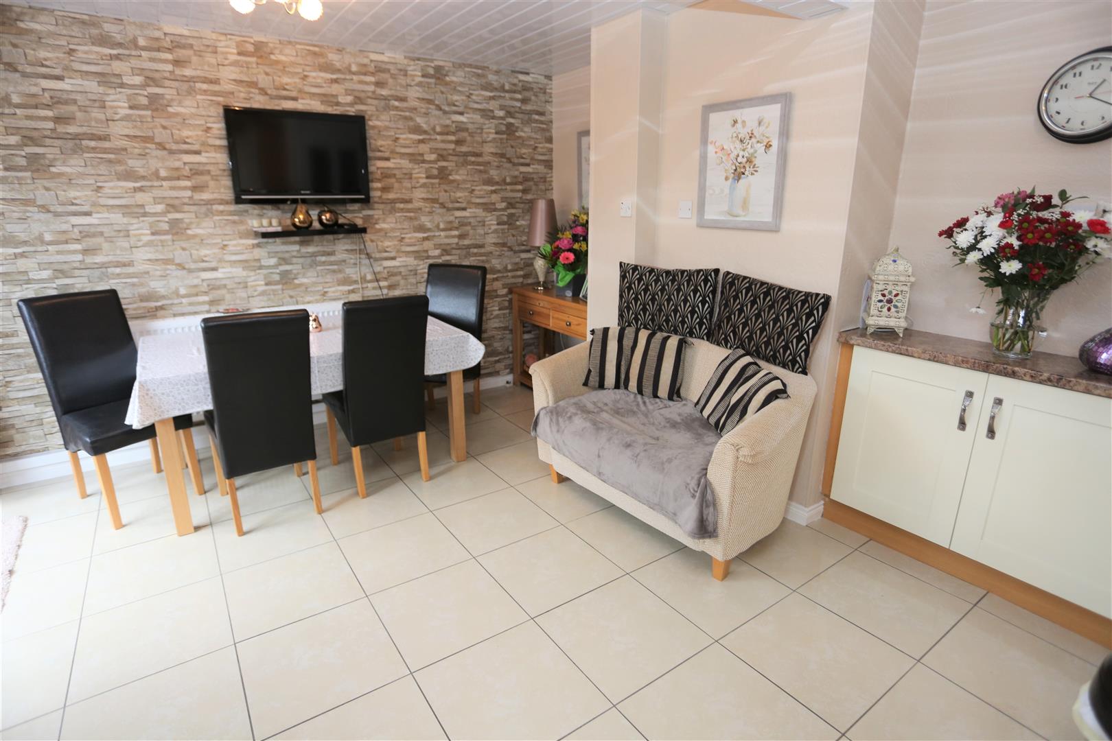 A range of high & low level units. Glazed units. 1.5 stainless steel sink unit. Space for cooker, fridge/freezer and washing machine. Tiled flooring. Partially tiled walls. Double panel radiator. PVC panel ceiling. Glazed PVC door leading to rear garden