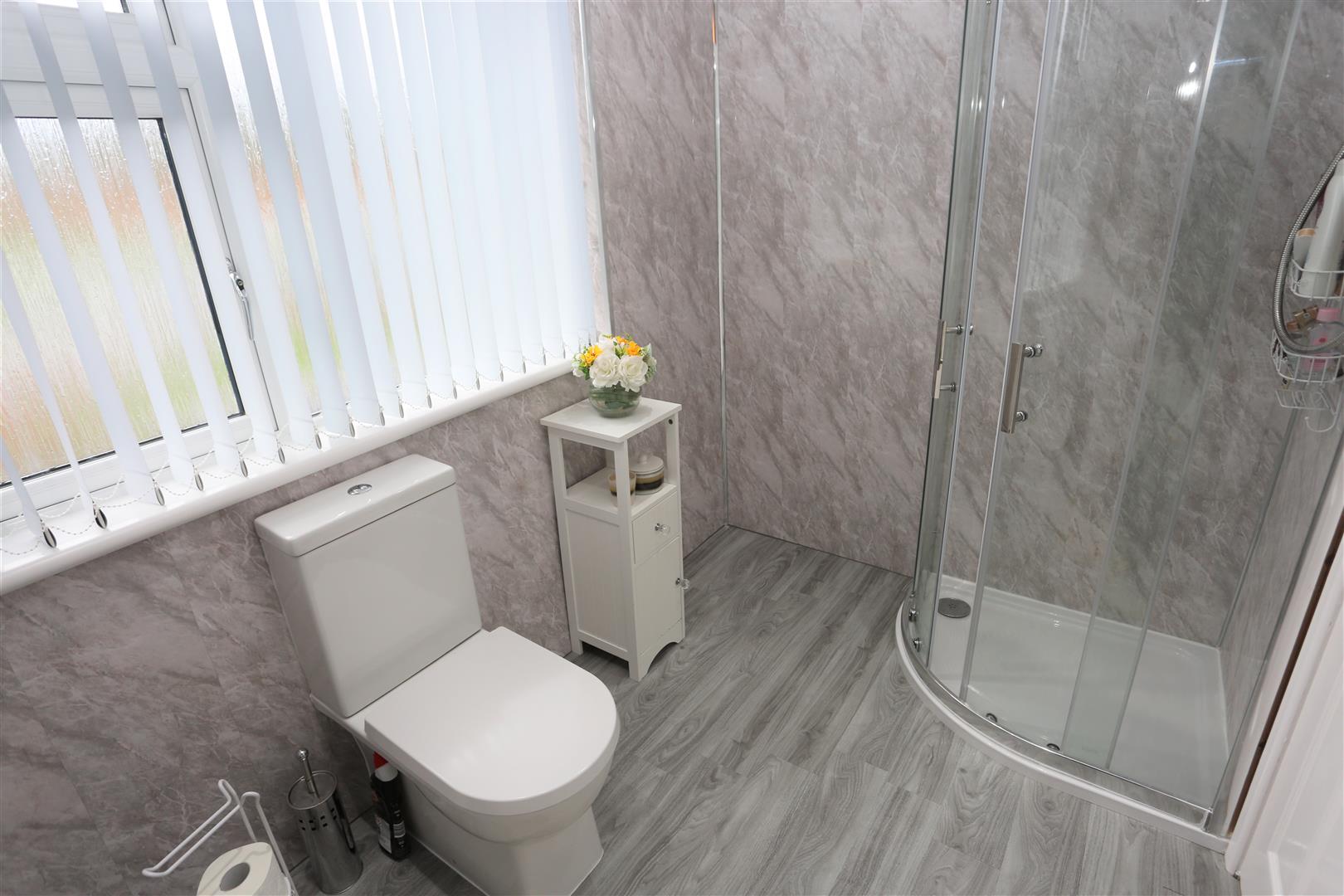 Comprising of a three piece suite; shower enclosure with electric unit, wash hand basin with vanity unit and low flush WC. PVC panel ceiling and walls. Single panel radiator.
