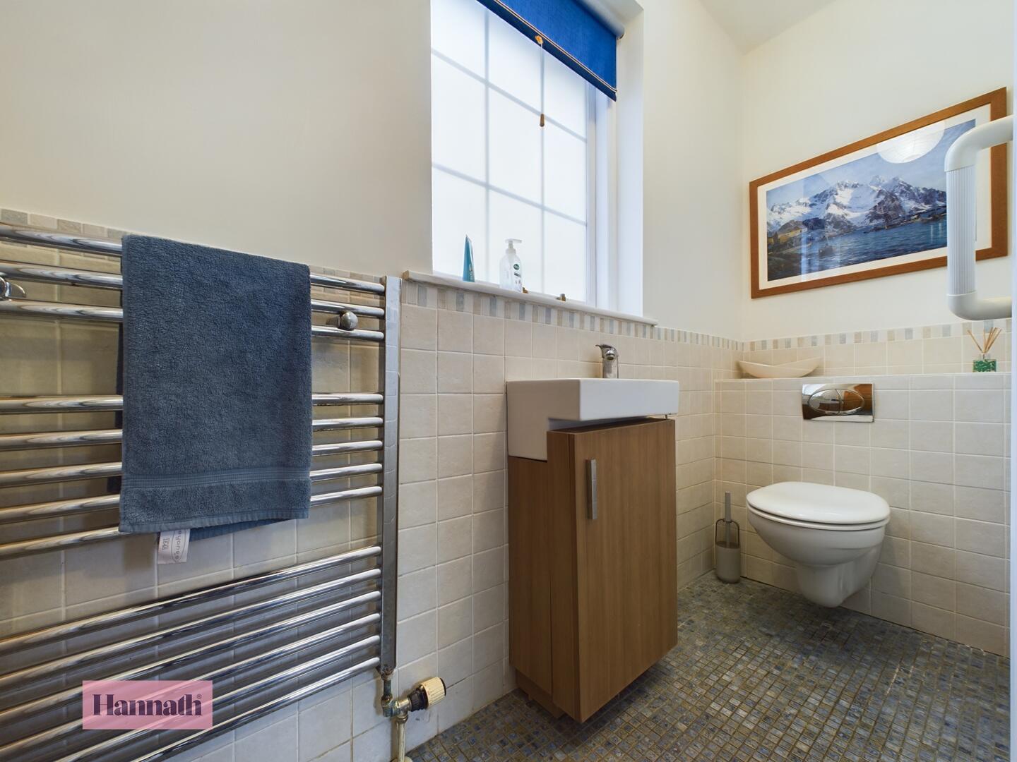 Wash hand basin, w.c., tiled flooring and part tiled walls, heated towel rail, hot press
