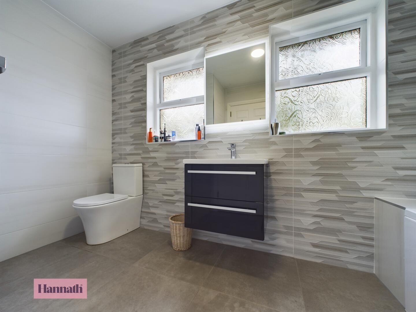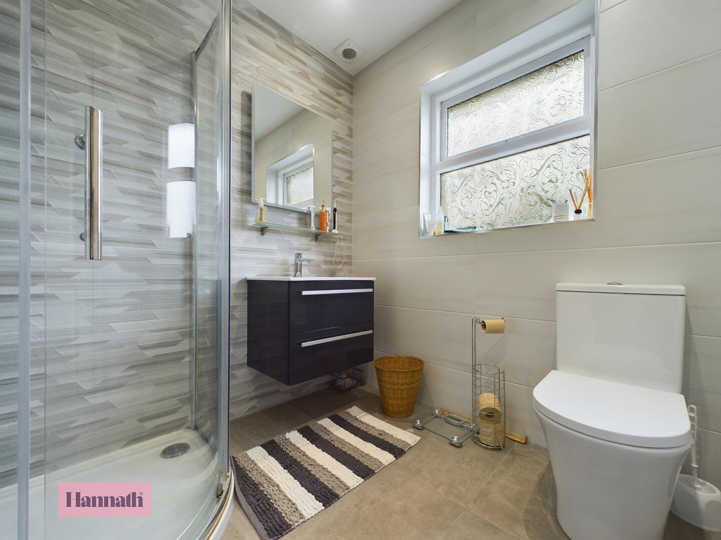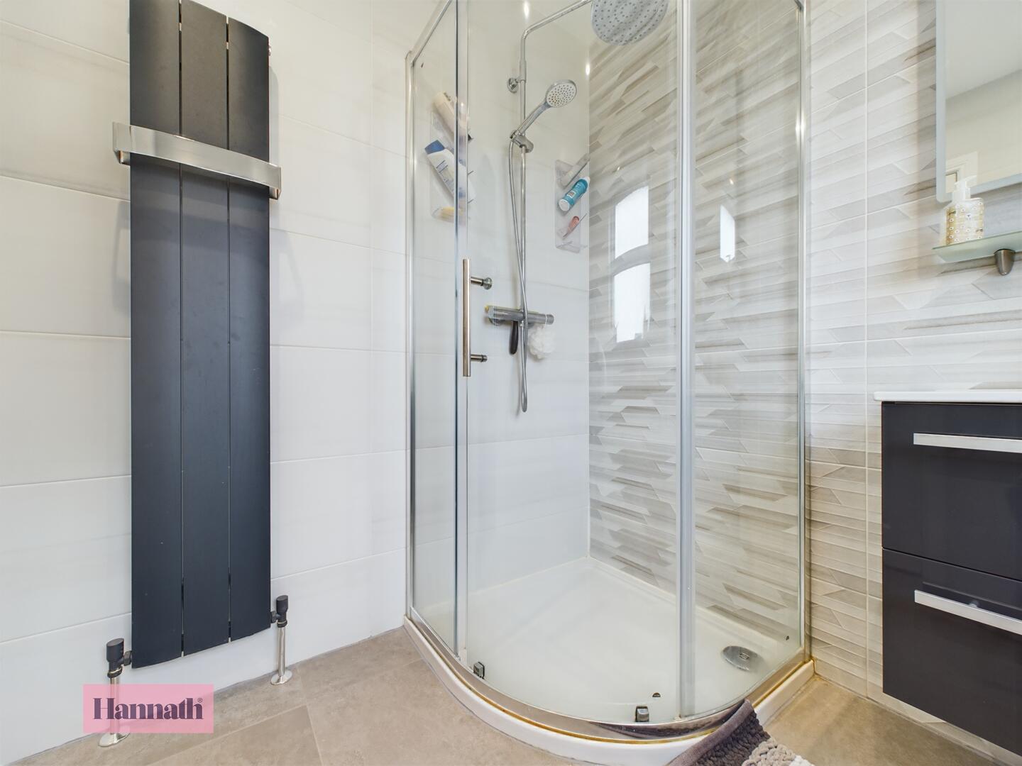 3 piece suite comprising, shower unit, wash hand basin, w.c., tiled flooring and walls, wall mounted radiator, extractor fan