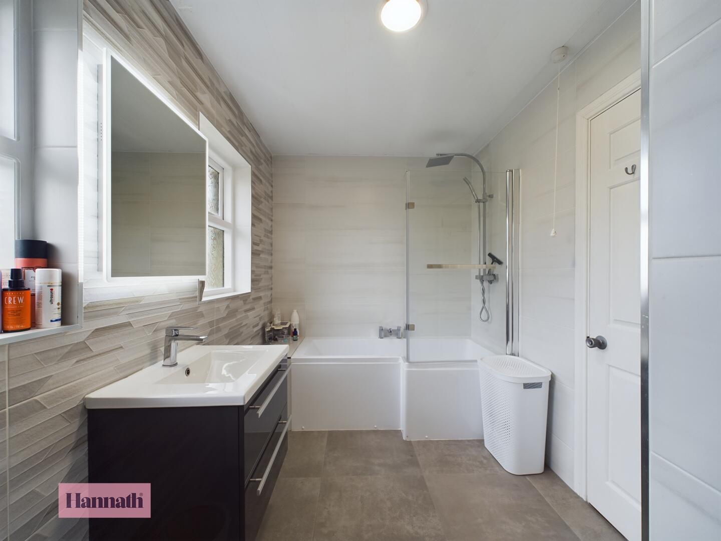 3 piece suite comprising shower over bath, wash hand basin, w.c., tiled walls and floors, wall mounted radiator