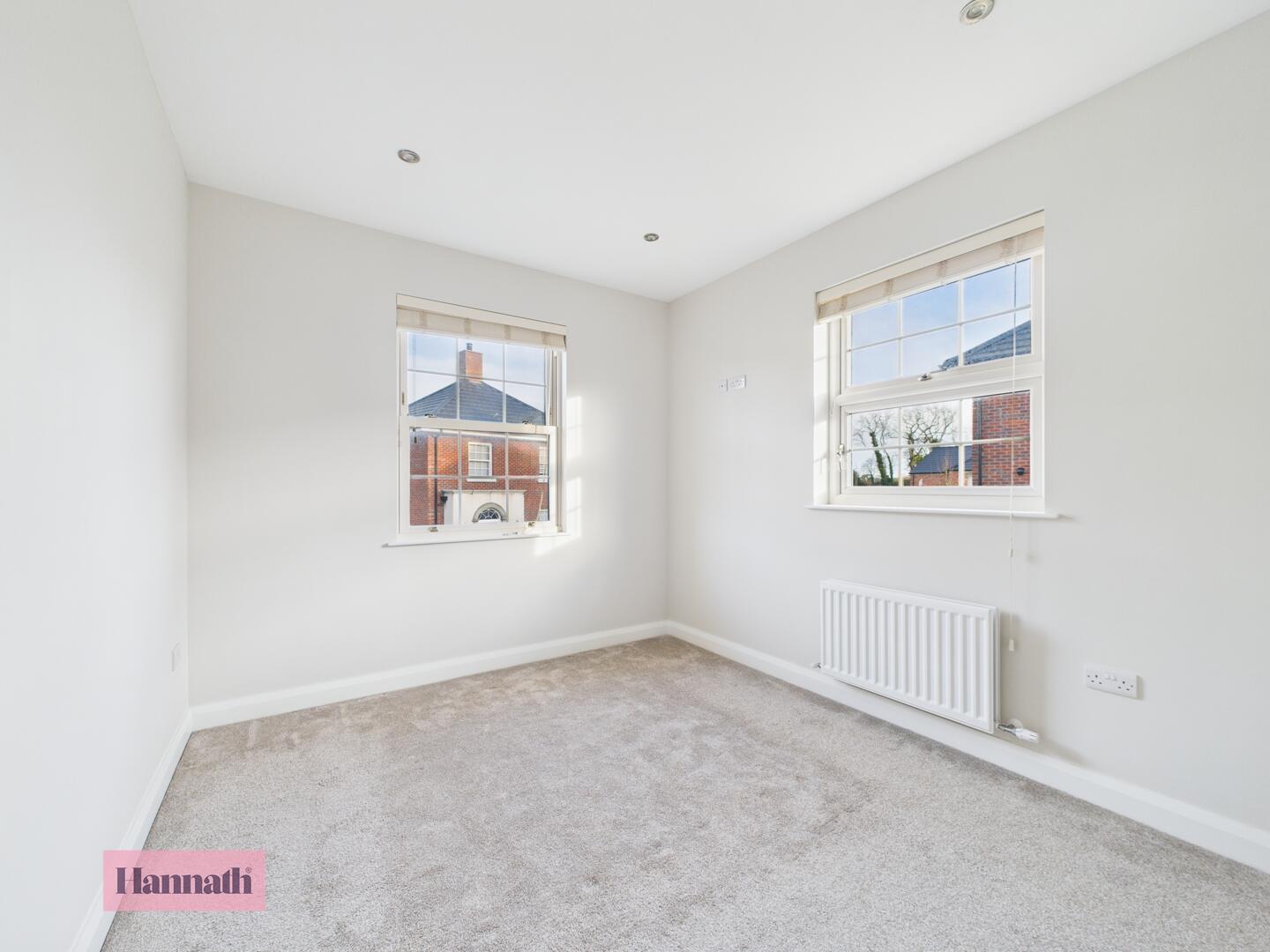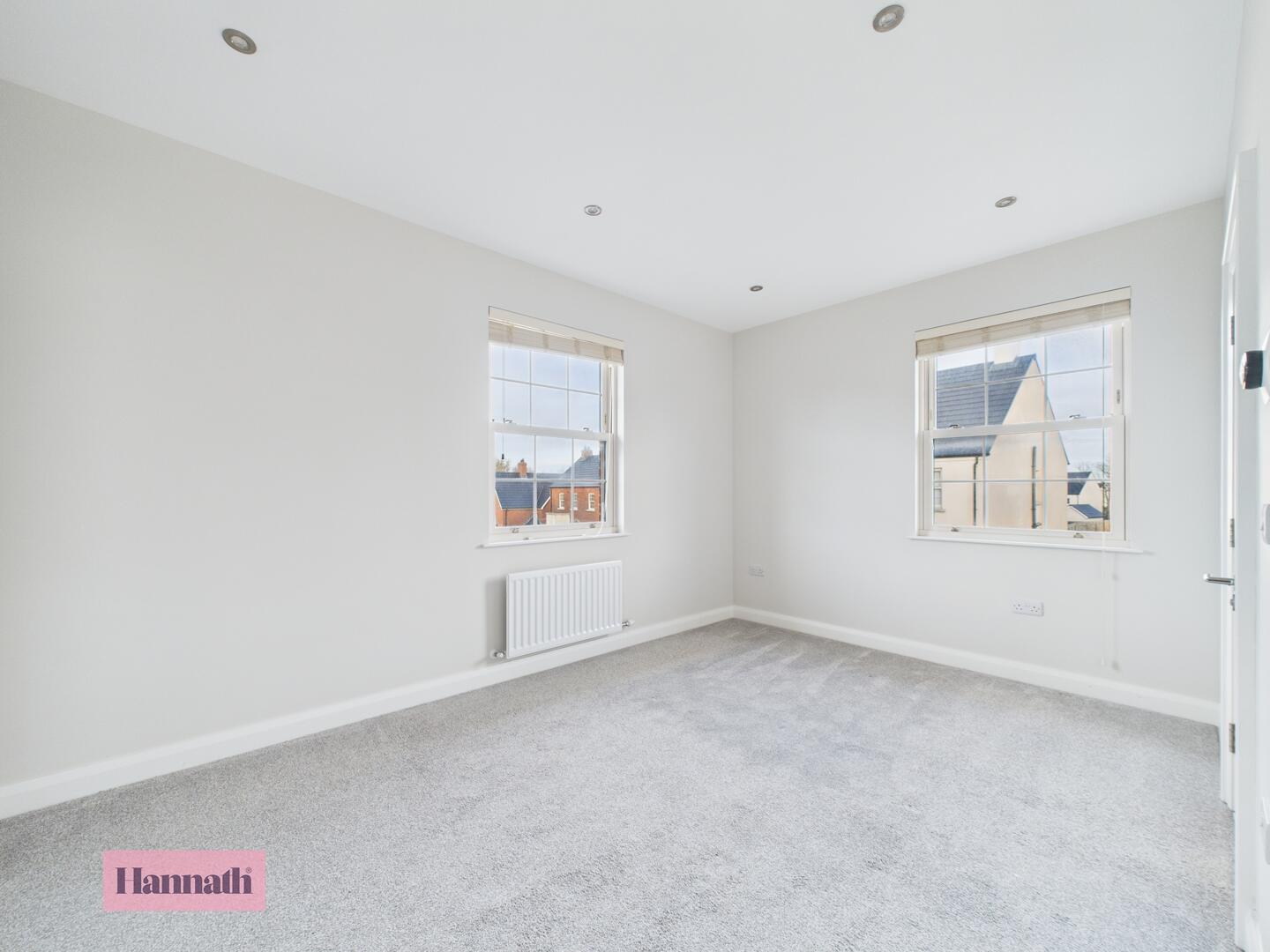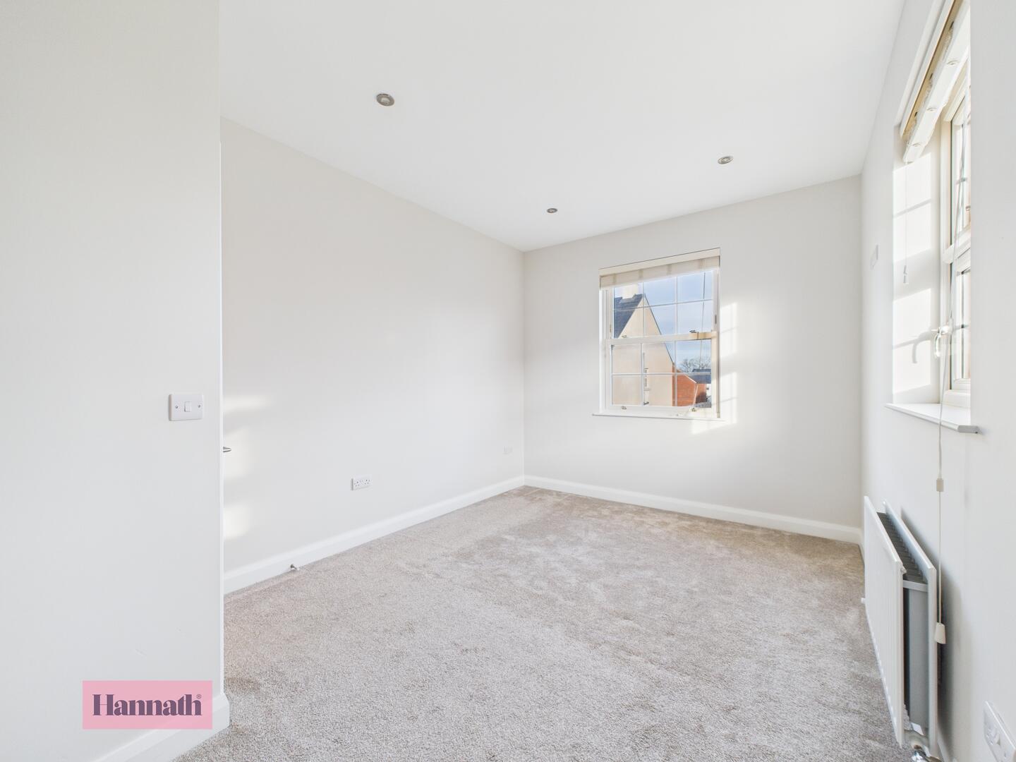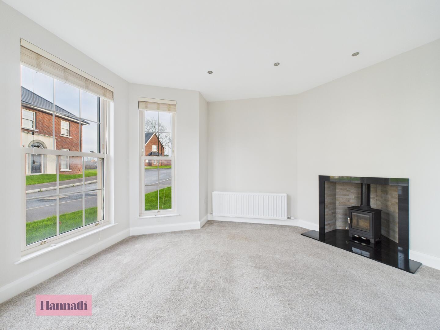 Carpet, bay window, radiator, spot lights & wood burning stove