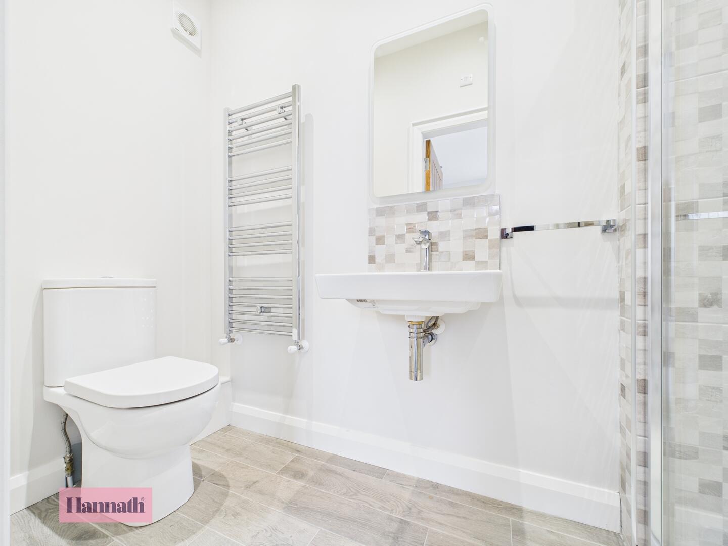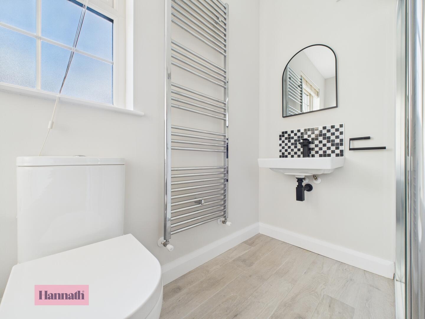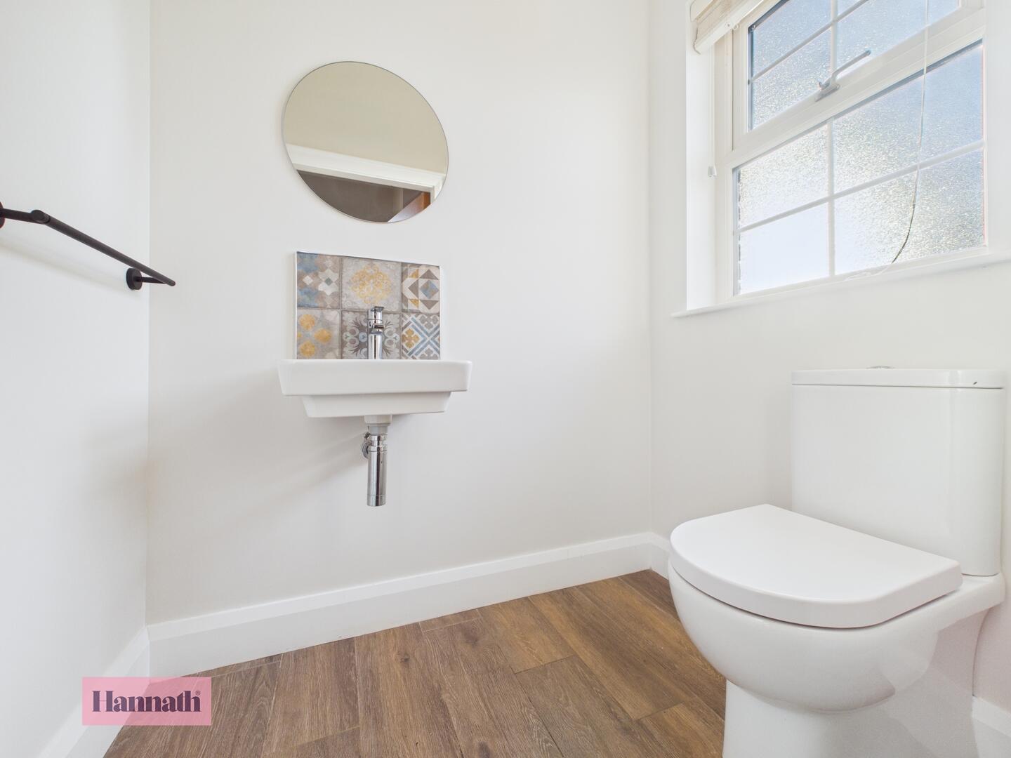 Low flush WC, pedestal wash hand basin with tiled splashback, spot lights & wooden floor