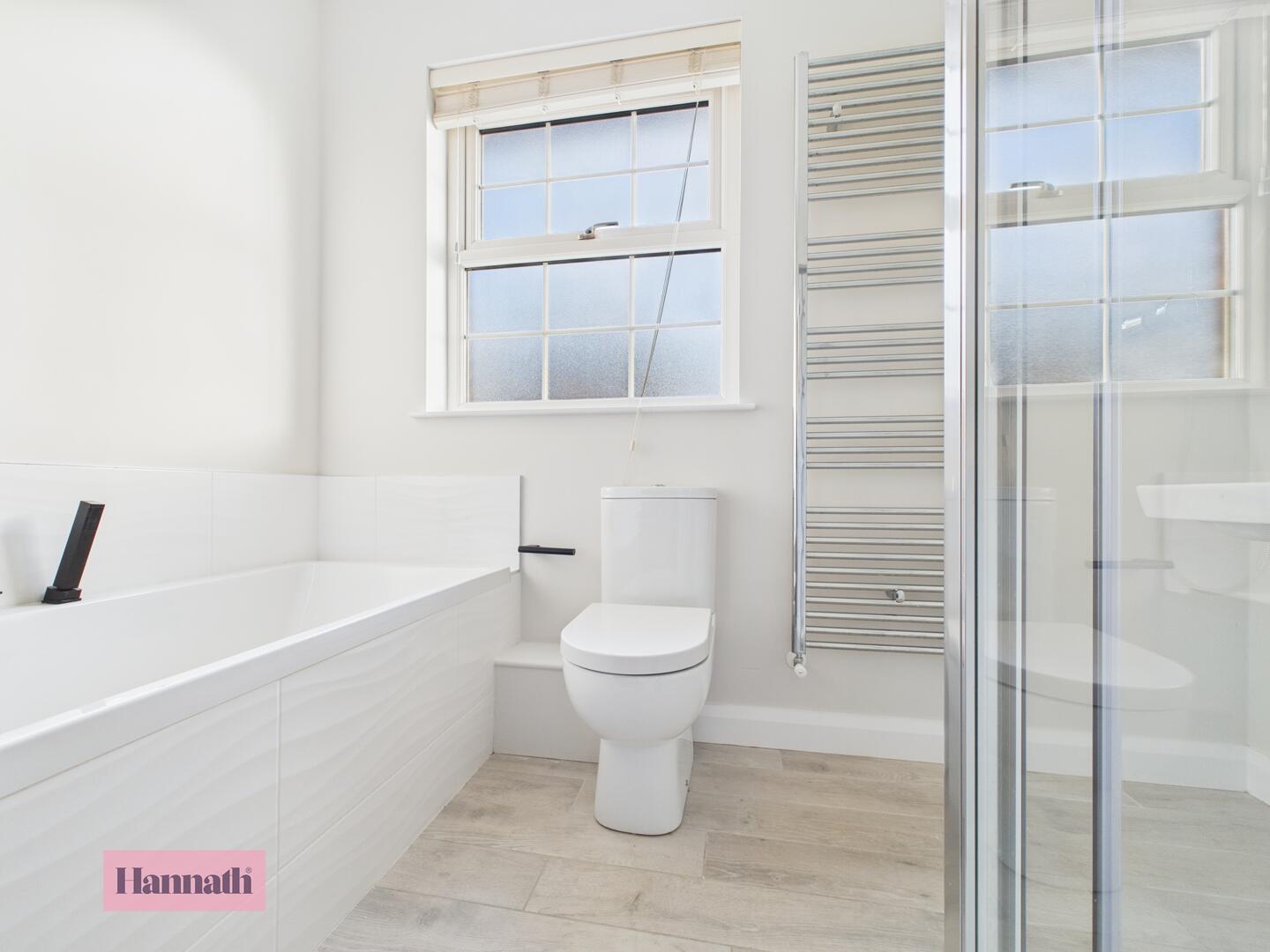 Four piece family suite comprising of; shower enclosure, bath, low flush WC, pedal wash hand basin with tiled splashback, partially tiled, chrome towel radiator & spot lights