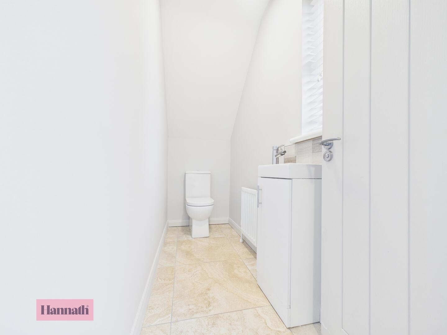 This WC is narrow and functional with a modern white suite including a toilet and basin, complemented by floor tiles and a window to the side allowing natural light.