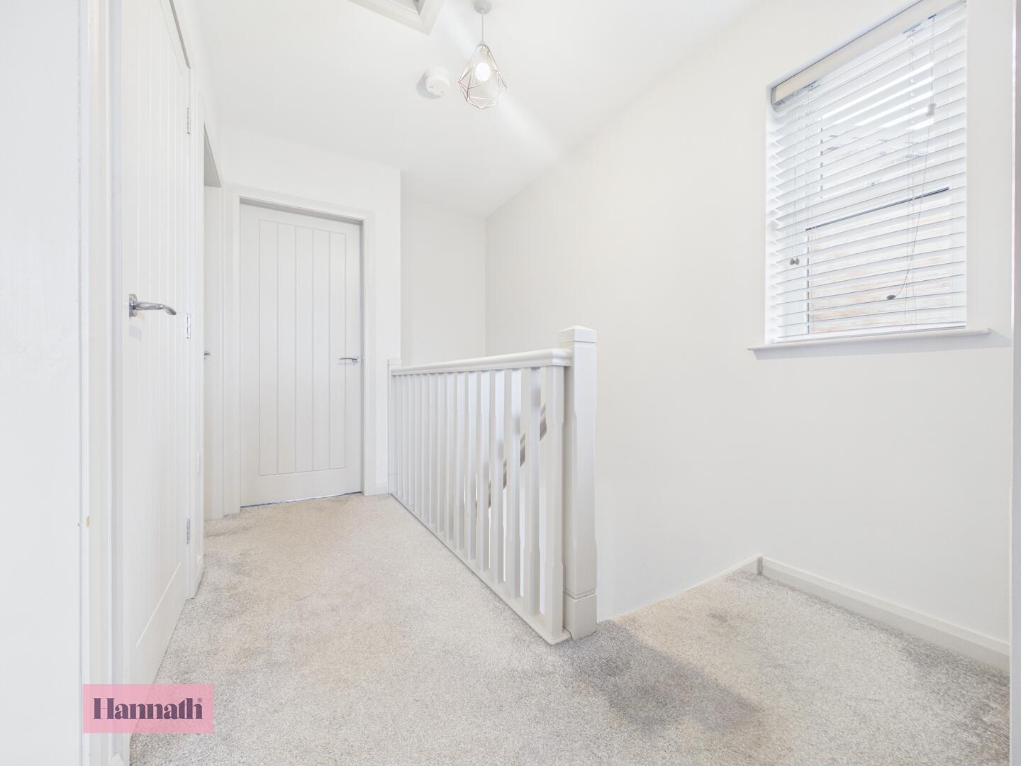 The landing upstairs is a bright and open space, carpeted in a soft neutral tone with white woodwork and bannisters. A window provides natural light, and it provides access to the bedrooms and bathrooms.