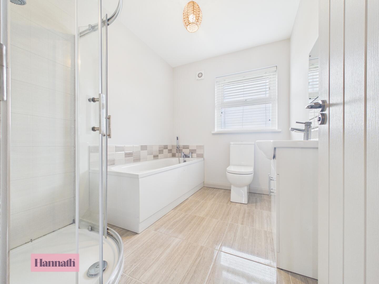 The bathroom is modern and spacious, featuring a bath, separate shower cubicle, toilet, and sink. Contemporary tiling on the floor and walls adds a clean finish, along with a window for natural light and ventilation.