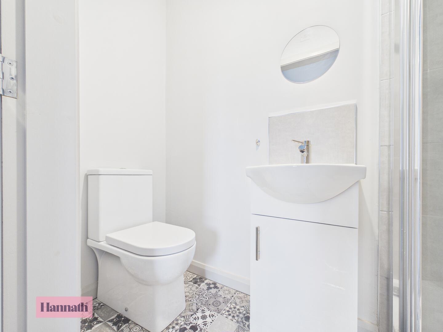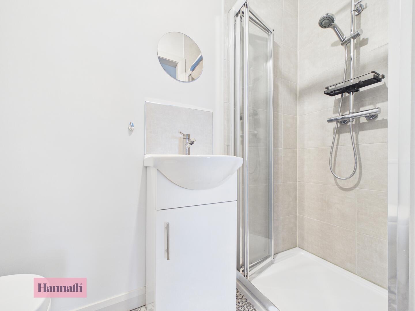 The en-suite shower room off Bedroom 1 is compact and smartly finished, featuring a corner shower cubicle, basin with storage beneath, and a circular mirror above. The decor is simple and functional.