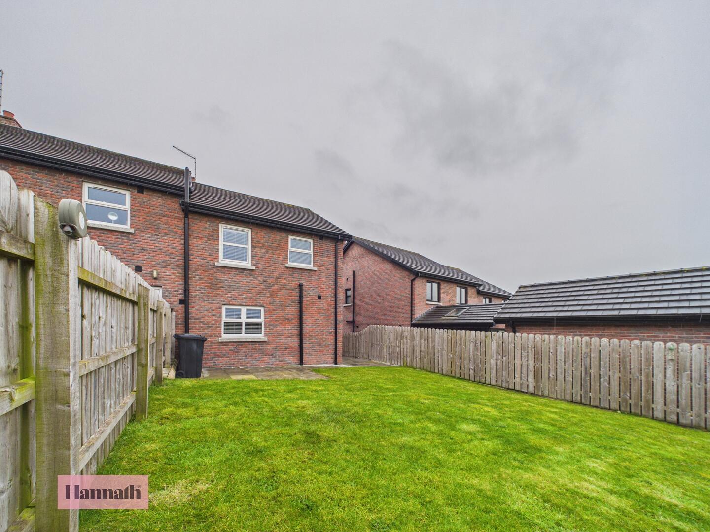 The rear garden offers a generous lawn bordered by wooden fencing, providing a private and secure outdoor space. A paved patio area is ideal for outdoor seating or dining, making it a pleasant extension of the home for relaxing or entertaining.