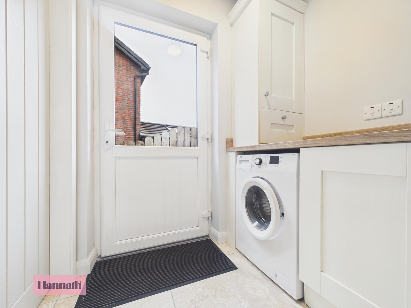 The utility room is compact and practical, with tiling that matches the kitchen and space for laundry appliances. It also has a door providing access to the outside, making it a convenient service area.