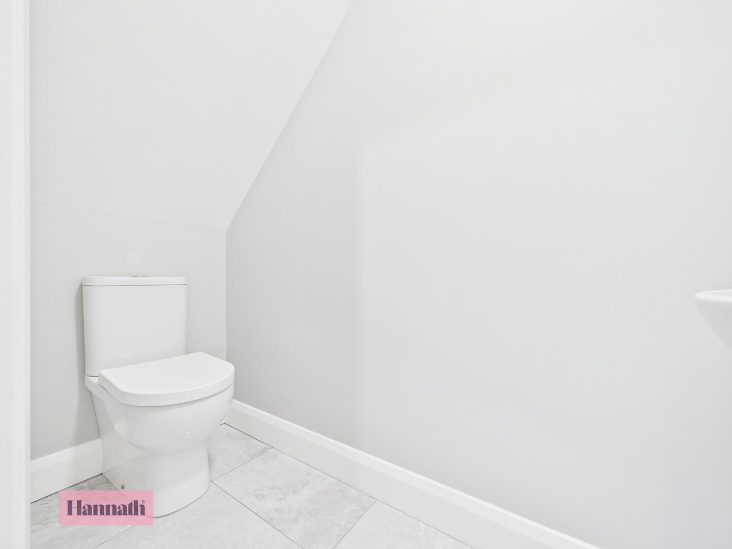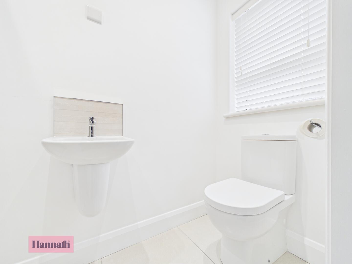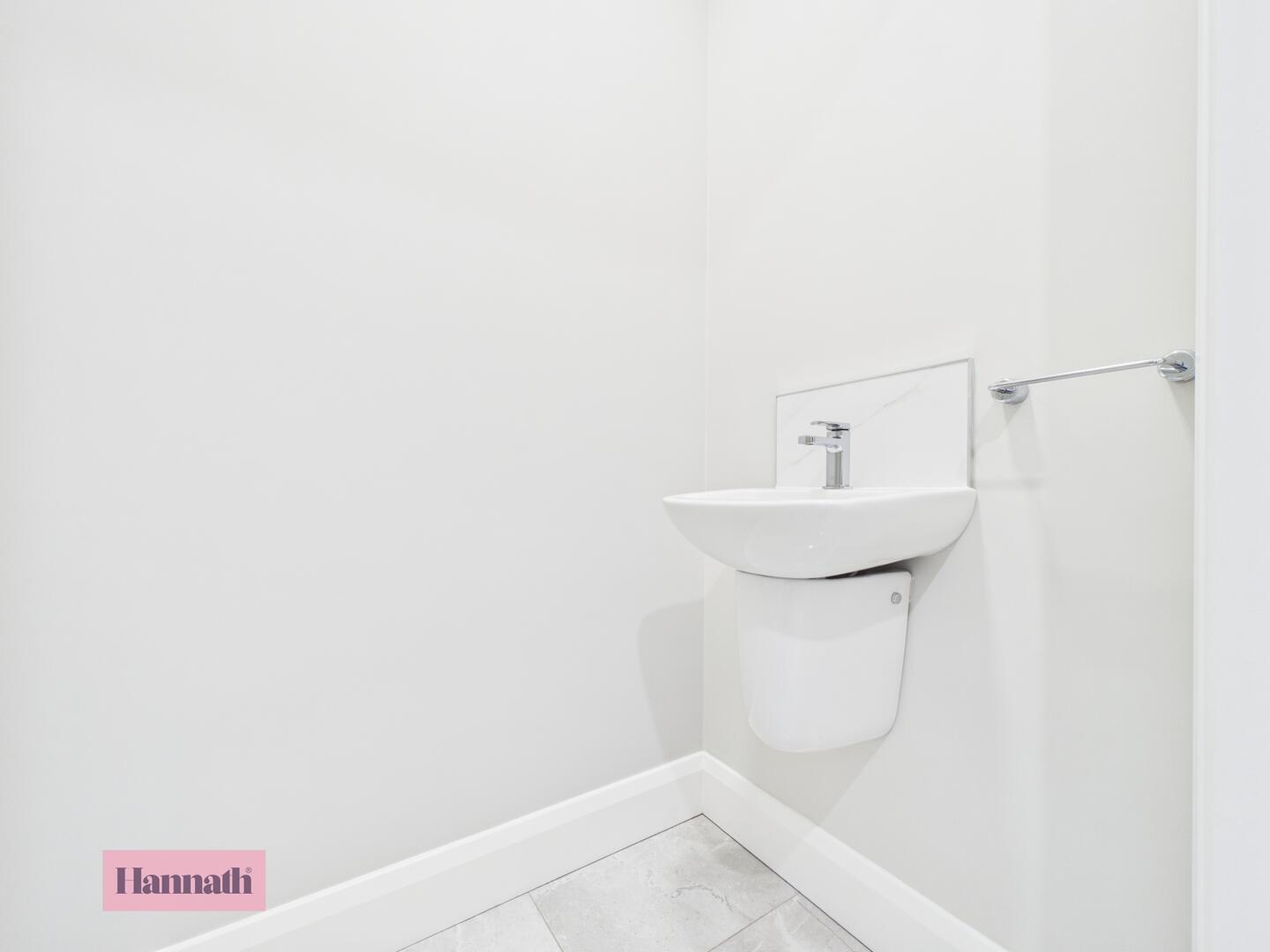 The ground floor cloakroom is presented with light neutral tiling on the floor and walls, featuring a modern white toilet and a compact wall-mounted sink. The space is kept bright and fresh with neutral walls and simple fixtures, offering practical convenience on the ground level.