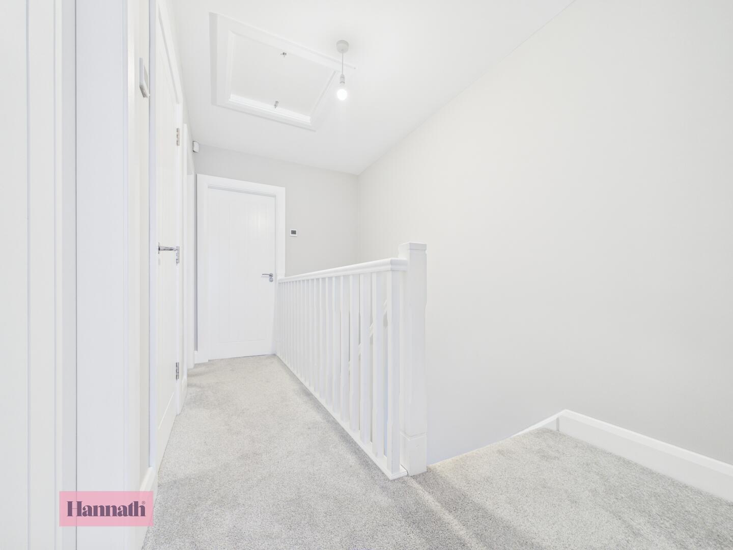 The first-floor landing is carpeted and finished in neutral tones, with a white banister providing a classic touch. It serves as a central point connecting the bedrooms and bathrooms.