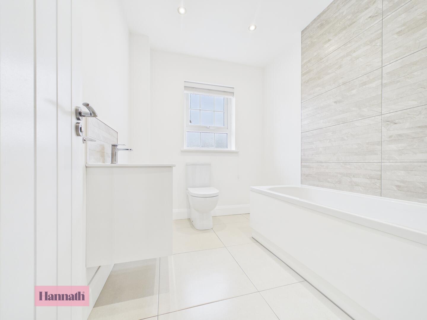 The family bathroom is bright and modern with tiled flooring and a white suite including a bath, toilet, and basin. A window provides natural light and ventilation, while the neutral tiling around the bath adds a clean and polished finish.
