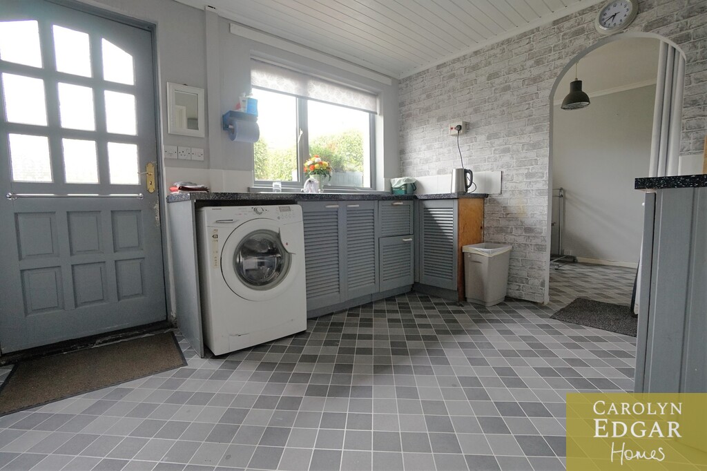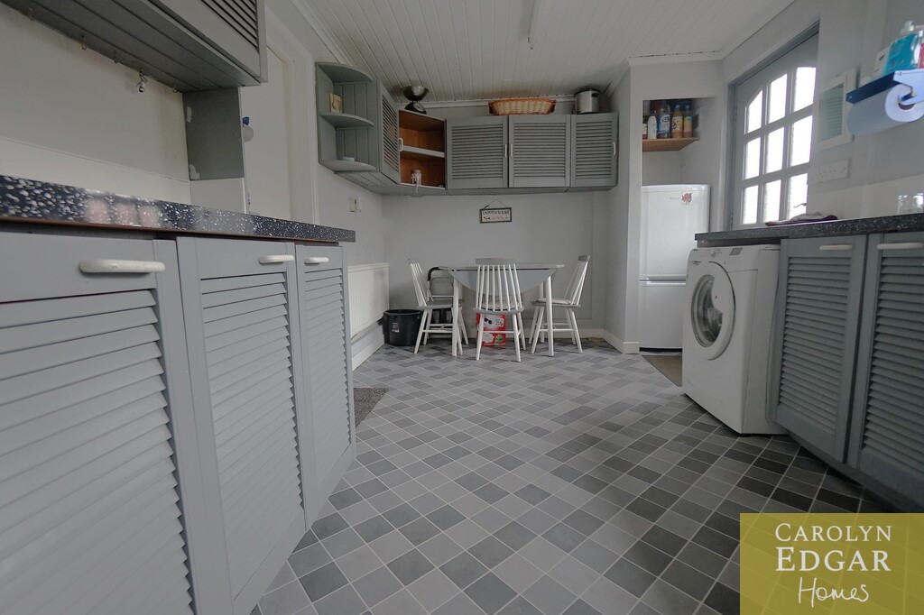 Ample range of high and low level painted units. Plumbed for white goods. Casual dining area. Built in wall storage. Tiled effect flooring.Access to rear garden.
