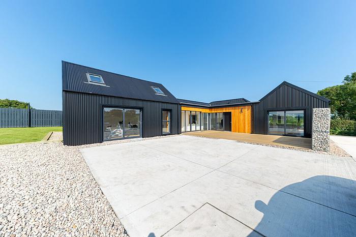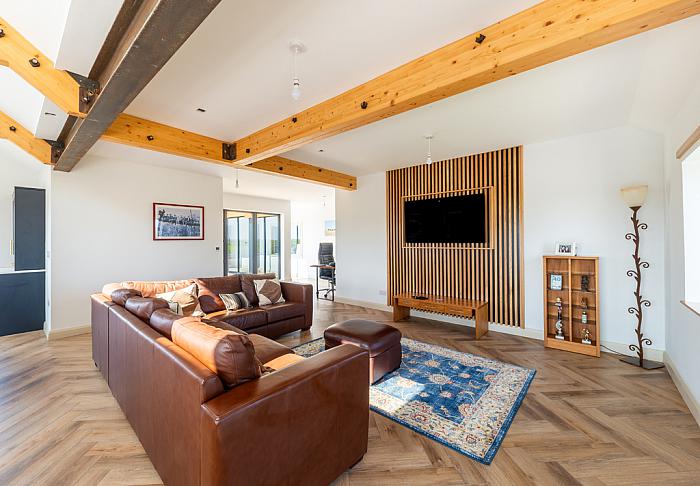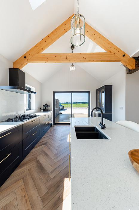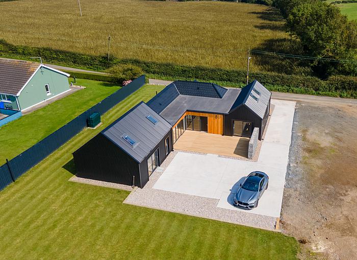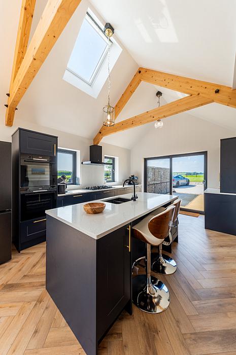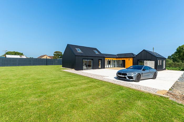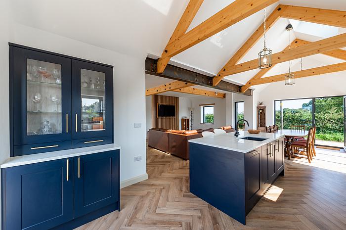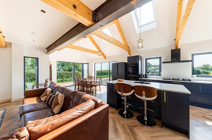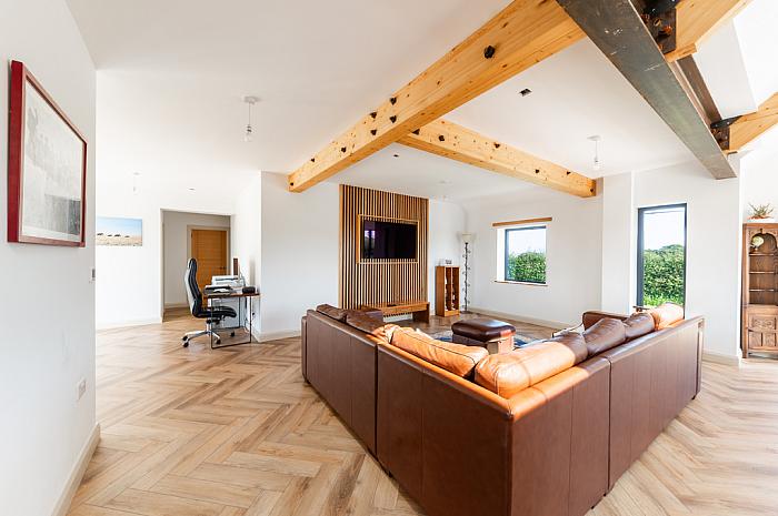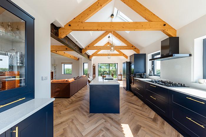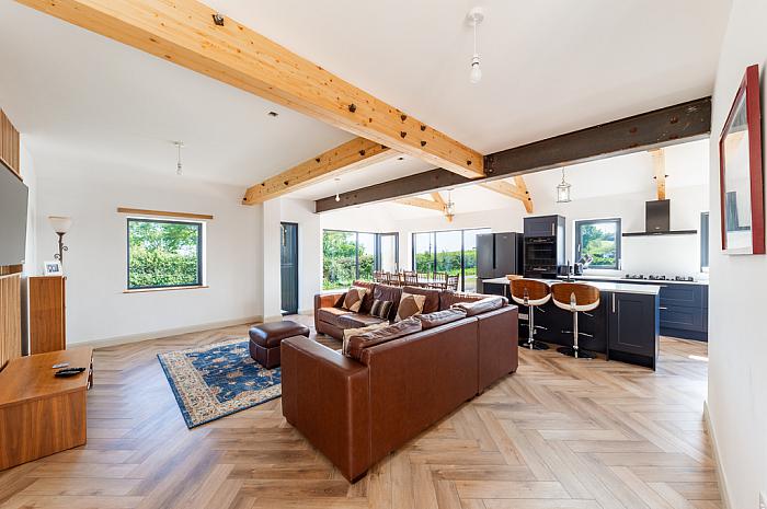 The property is set on a prime site with fabulous views of the surrounding countryside and with many extra features provides a unique contemporary living space in a beautiful country location. Finished to the highest standard with no expense or attention to detail spared the property comprises of fabulous dual aspect bespoke open plan luxury fitted kitchen with quartz work surfaces and splash backs, centre island, Franke sink and taps, Bosch 5 ring gas hob, Bosch double oven, Oak LVT flooring and feature exposed trusses open plan to family area. The glazed walkway overlooks the gardens and rear sun terrace and leads to the extensive lounge area, or possible master bedroom, again with exposed trusses and views overlooking the surrounding area. The three well portioned bedrooms, one with dressing area and two contemporary bathroom suites finish off this exceptional home. Externally the property is set on a generous sized plot with ample car parking, landscaped rear gardens and composite decked sun terrace with outstanding views, the perfect place to sit and unwind in these very special surroundings.