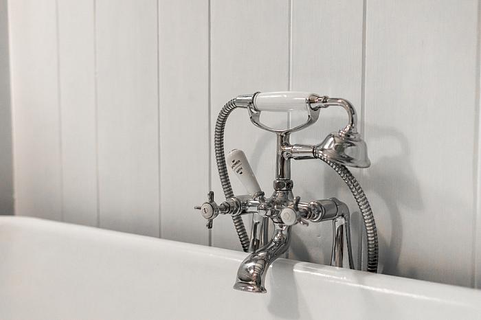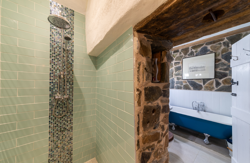 Luxury Bathroom with Freestanding Bath and Exposed Brick Walls