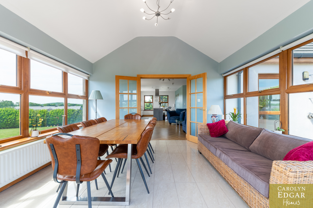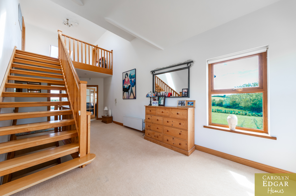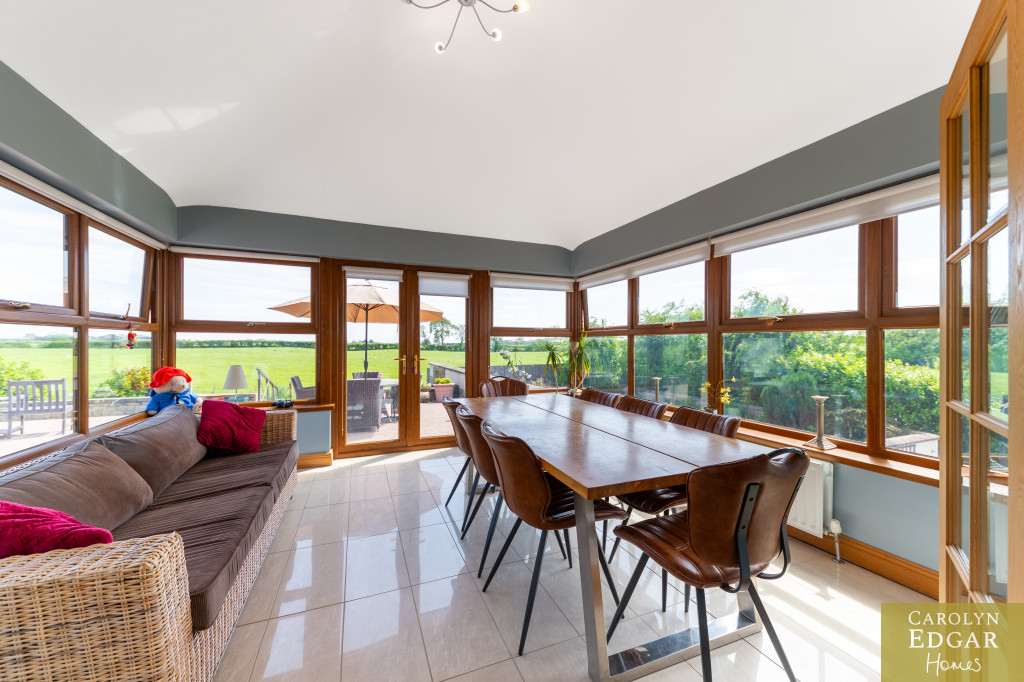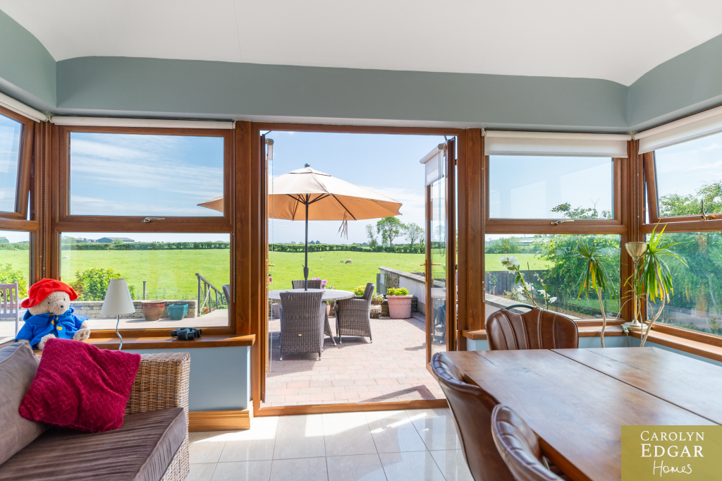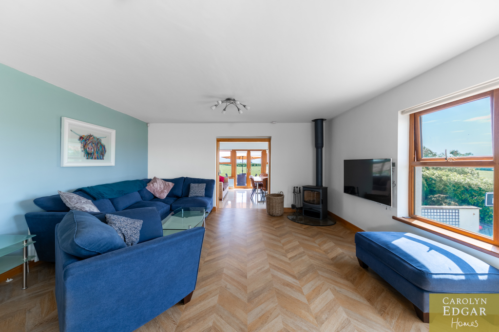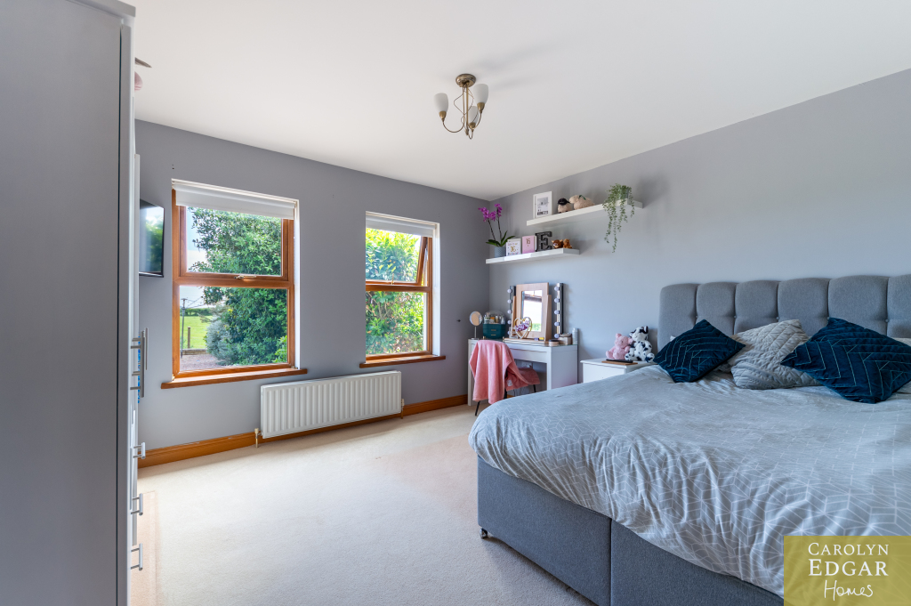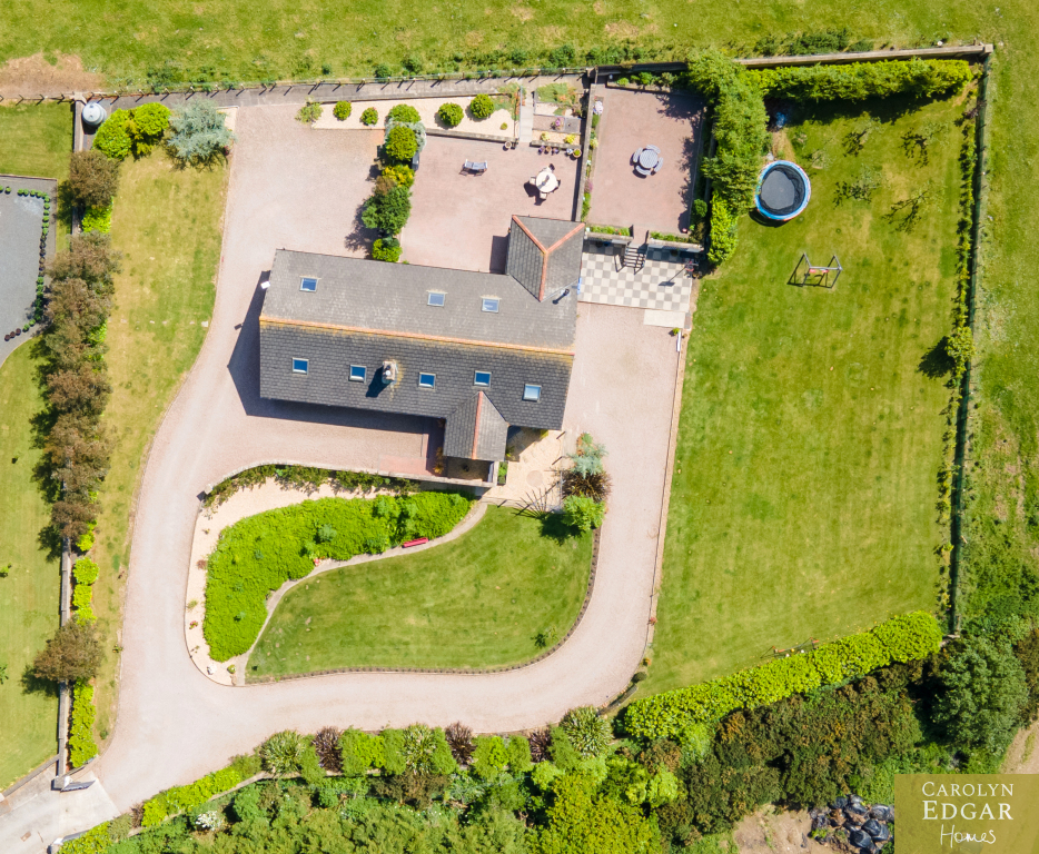 Located down private laneway with a delightful country back drop this impressive six-bedroom home is set on a fabulous elevated site with stunning countryside views. The property is immaculately presented throughout and with a floor space of over 3500sqft offers a wealth of spacious and stylish living accommodation whatever your family needs, providing that extra space for live in relatives, staying guests or an expanding brood. Set in beautifully maintained gardens of circa 0.75 acres and approached by sweeping driveway the property has fantastic panoramic views of the surrounding area and with an abundance of outdoors space too that will suit any family's needs. Internally the property comprises of a large welcoming reception hallway, extensive lounge with fabulous garden views and feature inglenook fireplace with wood burning stove, bespoke open plan contemporary kitchen with large centre island/breakfast bar open to spacious modern living room with wood burning stove and fabulous views from every window, flooding with plenty of natural light, leading to sunroom overlooking the gardens with countryside views. Additionally, there are four double bedrooms, master with ensuite on the ground floor and contemporary family bathroom with freestanding bath and handy separate utility room. There are a further two beautifully presented double bedrooms on the first floor, large games rooms/third reception room and contemporary bathroom. On the lower level is access to a substantial double garage with extensive workshop/storage and WC, perfect for those looking for some extra space for work or a hobby, or somewhere for noisy teenagers to be out of ear shot! Outside the property is set on a well maintained mature site of 0,75 acres with secure electric gated driveway providing ample car parking for several cars, boat, or horse boxes and faultless wrap around gardens. To the rear of the property is paved patio area leading from the sunroom, a perfect spot for a barbecue, entertaining or just sitting and taking in the view, and extensive gardens laid in lawn with mature shrubs, fruit trees and second raised paved sun terrace. Only a short drive will bring Portaferry with its marina, restaurants, shops, and schools there are plenty of opportunities to enjoy the great outdoors, from sailing on the Strangford Lough, cycling, fishing, walking and with the bustling market town of Newtownards only 20 minutes way, this really does present a unique opportunity for those looking for a change of pace and the lifestyle that comes with it.