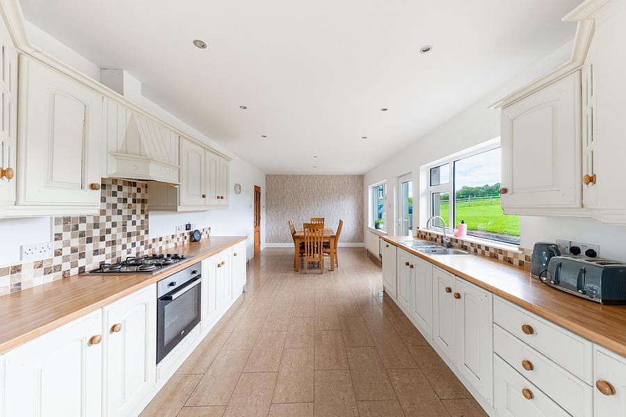 Internally the property comprises of bright entrance hallway, spacious lounge, overlooking the gardens with feature open fireplace, modern open plan kitchen with casual dining area leading out sunroom with views over the well-maintained gardens The property has five double bedrooms as well as contemporary bathroom and handy utility room. Outside the property has gated driveway and parking area for horse lorry or horse box, with separate access to extensive workshop/storage, tack room and six stables. The property comes with approximately five acres and carpet gallop providing a great opportunity not only to buy a home but with all the capacity for your equestrian needs that comes with it too.
