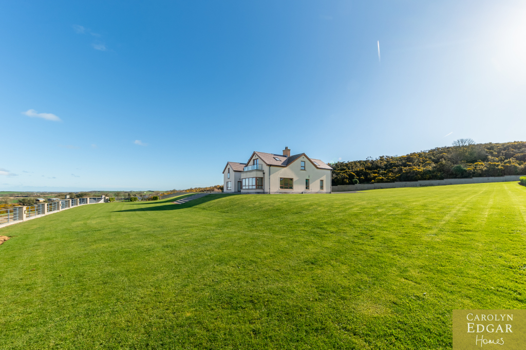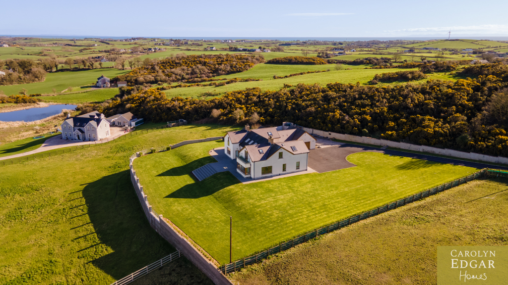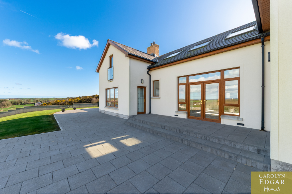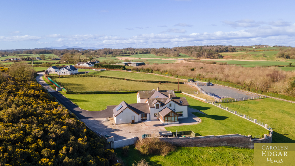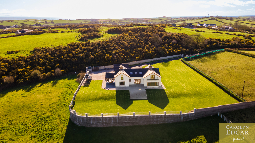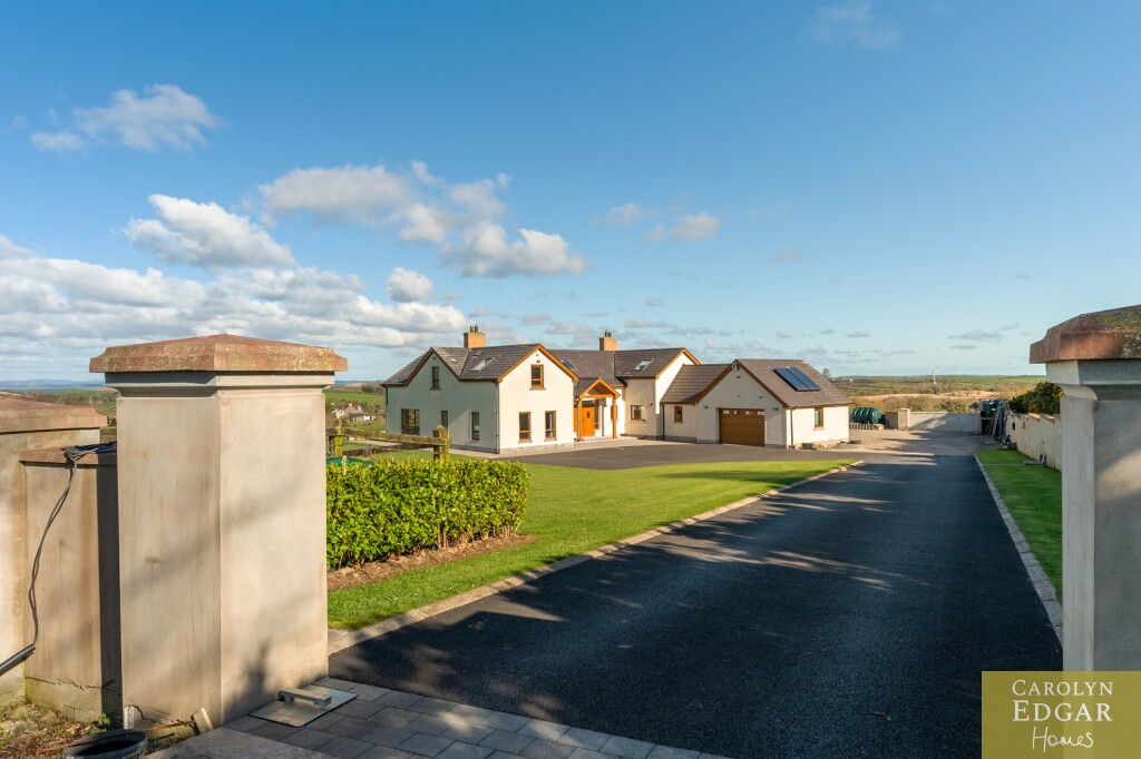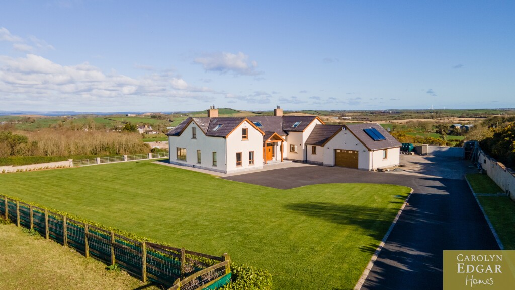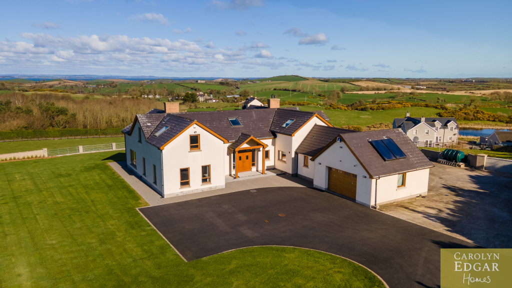 Nestled down a private laneway with a delightful country back drop this impressive five-bedroom home is set on a fabulous elevated private site with magnificent countryside views. Finished to the highest standard and immaculately presented throughout with an impressive floor space of over 3500sqft this contemporary home offers a wealth of spacious and stylish living accommodation whatever your family needs, from providing that extra space for live in relatives, staying guests or an expanding family with abundant living accommodation including a large double bedroom with ensuite on ground floor. Set in beautifully maintained gardens of just over one acre the property has fantastic panoramic views of the surrounding area with an profusion of outdoor space and with extra land available will be ideal for those with equestrian or farming interests. Internally the property comprises of a large welcoming reception hallway with feature mistral gallery and solid oak staircase, extensive dual aspect lounge with fabulous countrywide views ,French doors out to the paved sun terrace, inglenook fireplace piped for gas fire and pelmet lighting, the large open plan contemporary kitchen is the heart of the home, with an ample range of built in appliances, wine fridge, quartz work surfaces and large centre island/breakfast bar, leading to spacious family room with open fireplace, French doors to sun terrace and open plan sunroom from kitchen with those spectacular views from every window that flood the room with plenty of natural light. Additionally, there is a large double bedroom with ensuite on the ground floor, separate office/study, large cloak room, separate utility room, bathroom and integrated double garage. The feature mistral gallery with glass balustrades offers a stylish and contemporary landing area with a further four beautifully presented large double bedrooms, two with en-suite and Juliet balcony and outstanding views over the area, luxury fully tiled family bathroom with freestanding bath and ample storage and laundry rooms. Outside the property is set on a well maintained mature site with installation in place for electric gate, extensive driveway providing ample car parking for several cars, boat, or horse boxes and boundless wrap around gardens. To the rear of the property is a paved patio area leading from the sunroom, a perfect spot for a barbecue, entertaining or just sitting and taking in the views. Only a short drive will bring Portaferry with its marina, restaurants, shops, and schools providing plenty of opportunities to enjoy the great outdoors, from sailing on the Strangford Lough, cycling, fishing, walking and with the bustling market town of Newtownards only 20 minutes way, this really does present a unique opportunity for those looking for a change of pace and the lifestyle that comes with it.