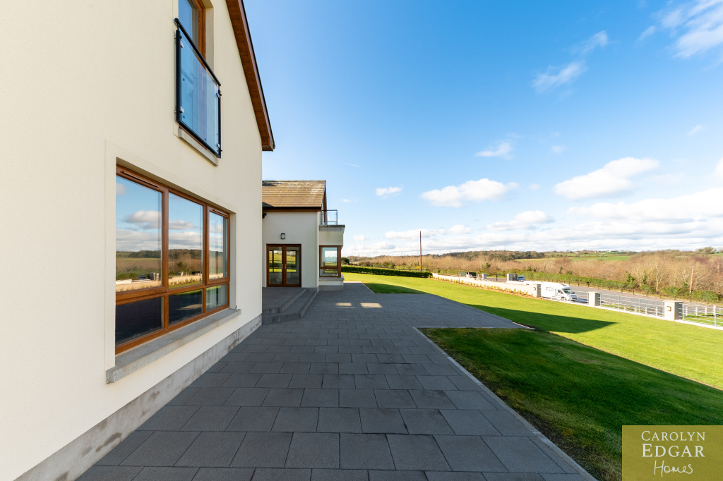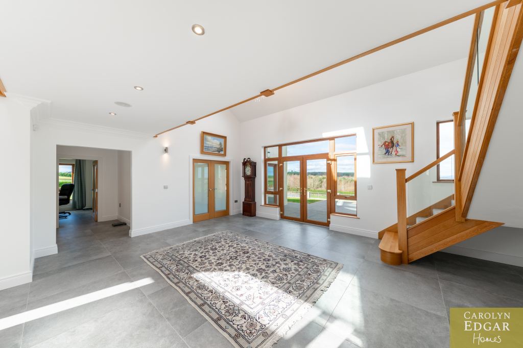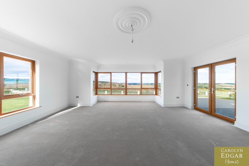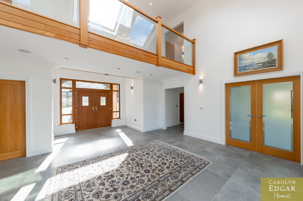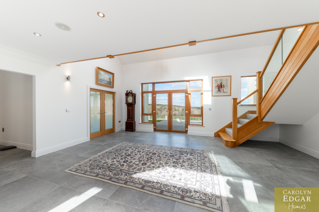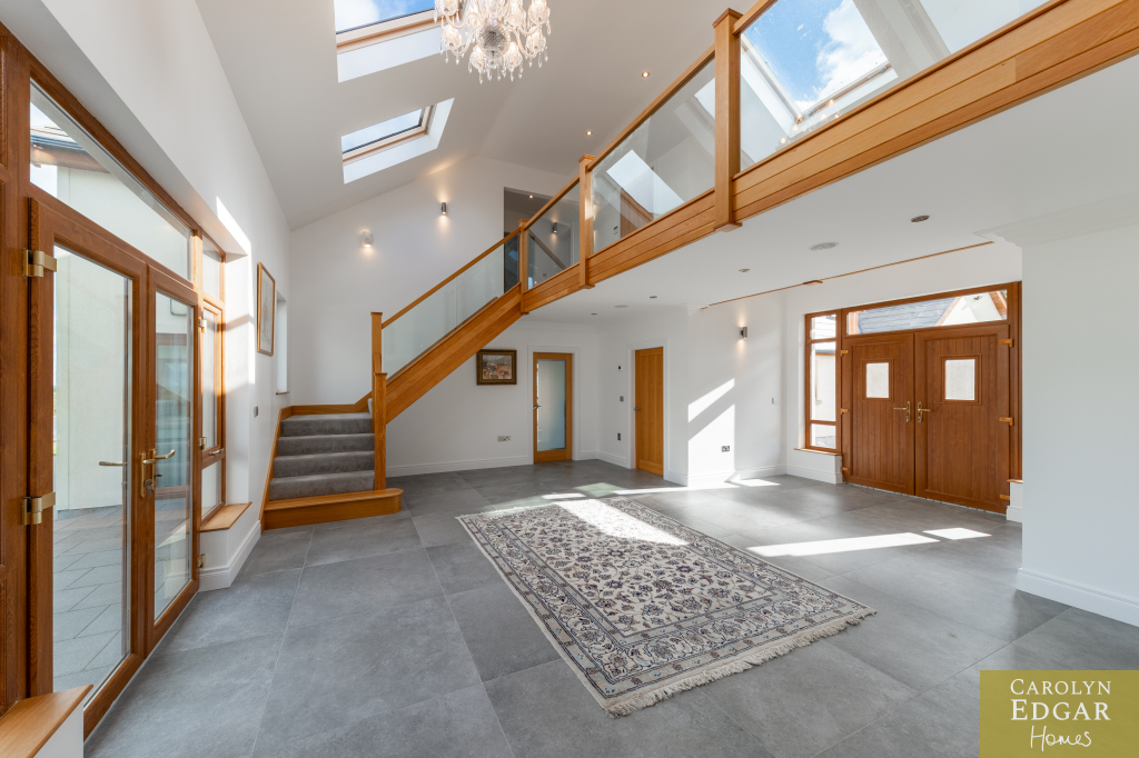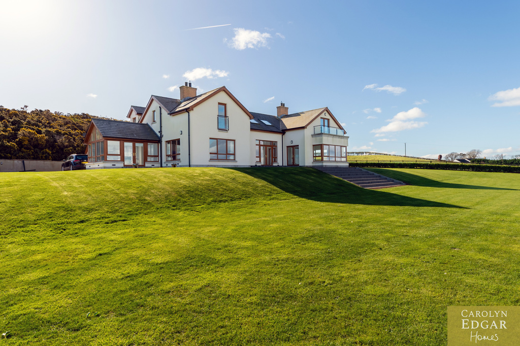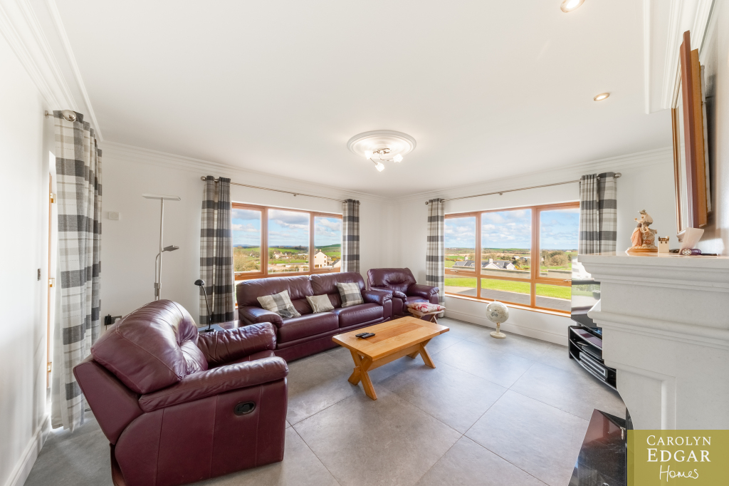 Nestled down a private laneway with a delightful country back drop this impressive five-bedroom home is set on a fabulous elevated private site with magnificent countryside views. Finished to the highest standard and immaculately presented throughout with an impressive floor space of over 3500sqft this contemporary home offers a wealth of spacious and stylish living accommodation whatever your family needs, from providing that extra space for live in relatives, staying guests or an expanding family with abundant living accommodation including a large double bedroom with ensuite on ground floor. Set in beautifully maintained gardens of just over one acre the property has fantastic panoramic views of the surrounding area with an profusion of outdoor space and with extra land available will be ideal for those with equestrian or farming interests. Internally the property comprises of a large welcoming reception hallway with feature mistral gallery and solid oak staircase, extensive dual aspect lounge with fabulous countrywide views ,French doors out to the paved sun terrace, inglenook fireplace piped for gas fire and pelmet lighting, the large open plan contemporary kitchen is the heart of the home, with an ample range of built in appliances, wine fridge, quartz work surfaces and large centre island/breakfast bar, leading to spacious family room with open fireplace, French doors to sun terrace and open plan sunroom from kitchen with those spectacular views from every window that flood the room with plenty of natural light. Additionally, there is a large double bedroom with ensuite on the ground floor, separate office/study, large cloak room, separate utility room, bathroom and integrated double garage. The feature mistral gallery with glass balustrades offers a stylish and contemporary landing area with a further four beautifully presented large double bedrooms, two with en-suite and Juliet balcony and outstanding views over the area, luxury fully tiled family bathroom with freestanding bath and ample storage and laundry rooms. Outside the property is set on a well maintained mature site with installation in place for electric gate, extensive driveway providing ample car parking for several cars, boat, or horse boxes and boundless wrap around gardens. To the rear of the property is a paved patio area leading from the sunroom, a perfect spot for a barbecue, entertaining or just sitting and taking in the views. Only a short drive will bring Portaferry with its marina, restaurants, shops, and schools providing plenty of opportunities to enjoy the great outdoors, from sailing on the Strangford Lough, cycling, fishing, walking and with the bustling market town of Newtownards only 20 minutes way, this really does present a unique opportunity for those looking for a change of pace and the lifestyle that comes with it.