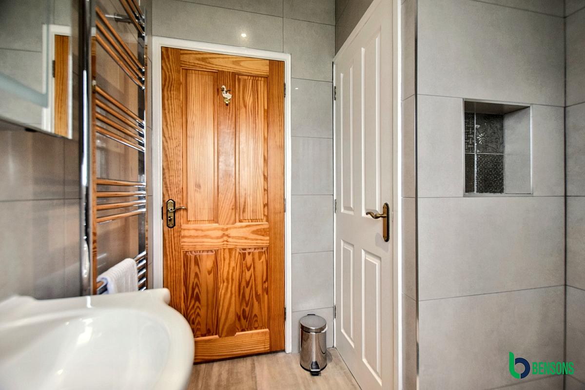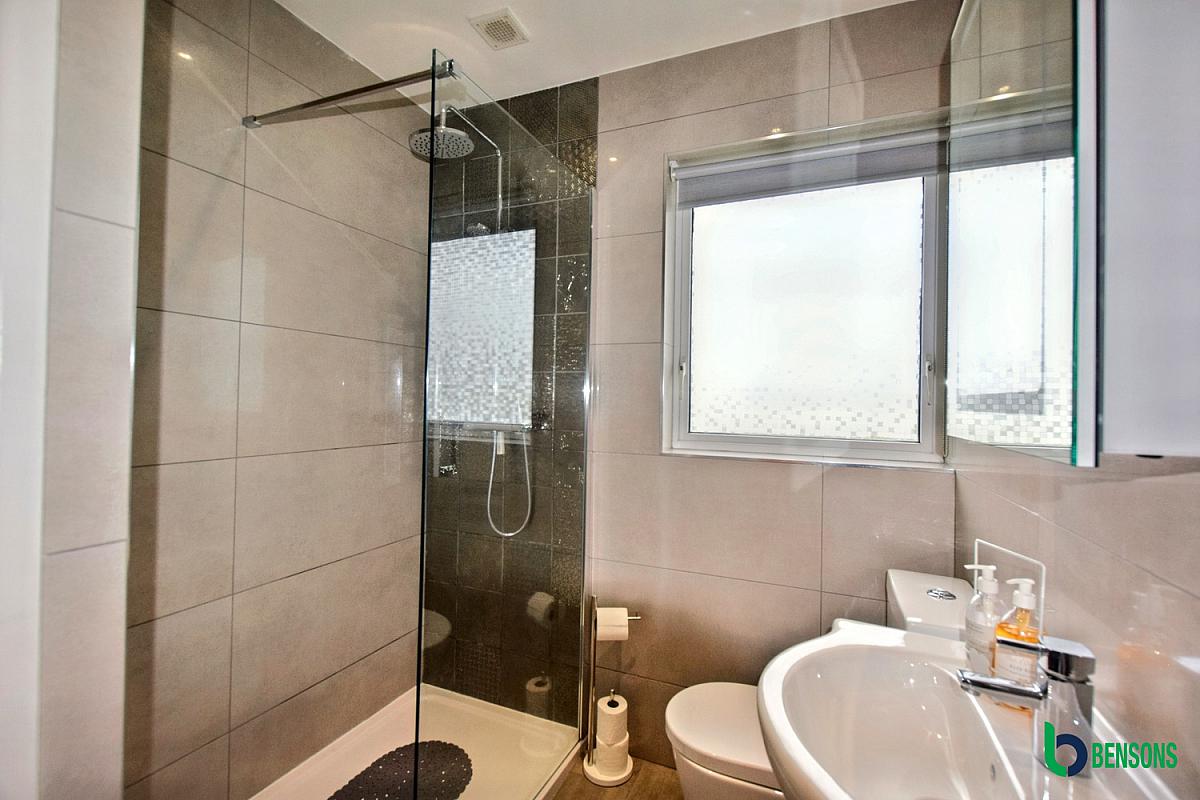 With WC, wash-hand basin, fully tiled walk-in shower cubicle, chrome heated towel rail, recessed ceiling lights, fully tiled walls and tiled floor.