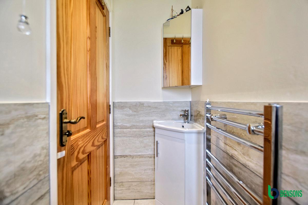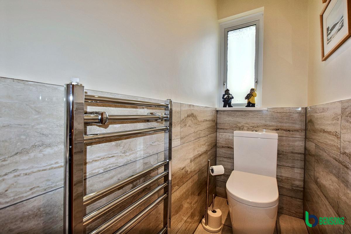 With WC, wash-hand basin, chrome heated towel rail, recessed ceiling lights, half-tiled walls and tiled floor.