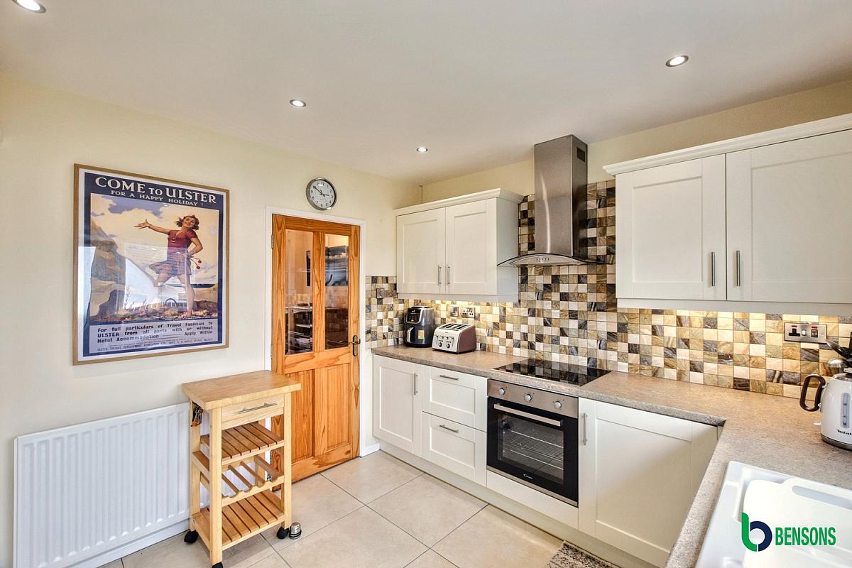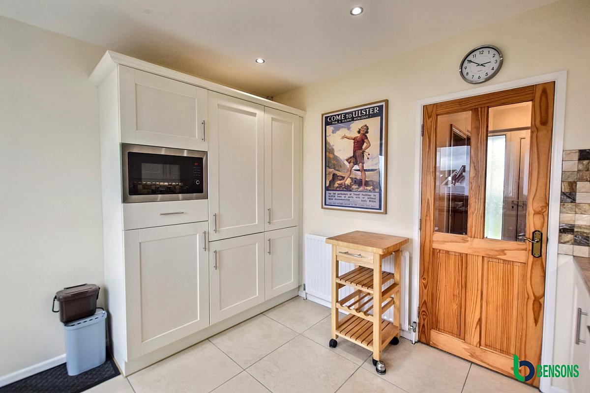 With a range of high & low-level units featuring soft-close drawers , tiling around worktops, concealed lighting, 1 1/2 bowl white ceramic sink unit, integrated hob & oven with extractor fan overhead, integrated "Beko" slim-line dishwasher, integrated microwave, integrated fridge freezer, pull out larder drawers, recessed ceiling lights and tiled floor.