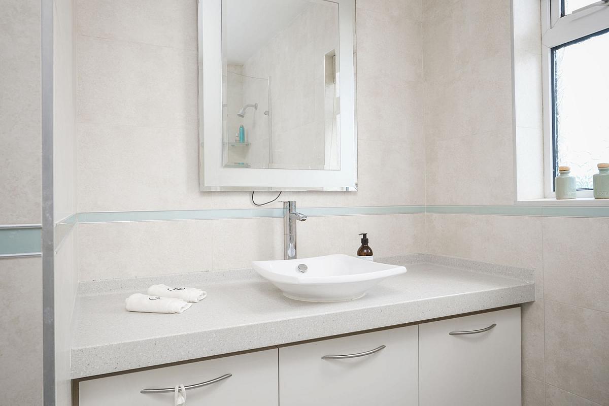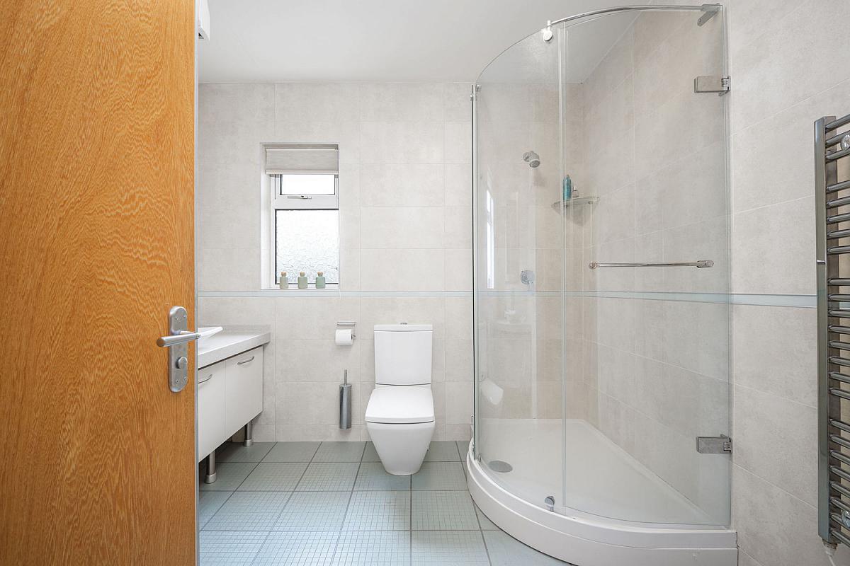 With white suite comprising w.c., wash hand basin set in vanity unit with storage below, illuminated mirror above, fully tiled walk in shower cubicle with mains shower, fully tiled walls, heated towel rail and tiled floor.