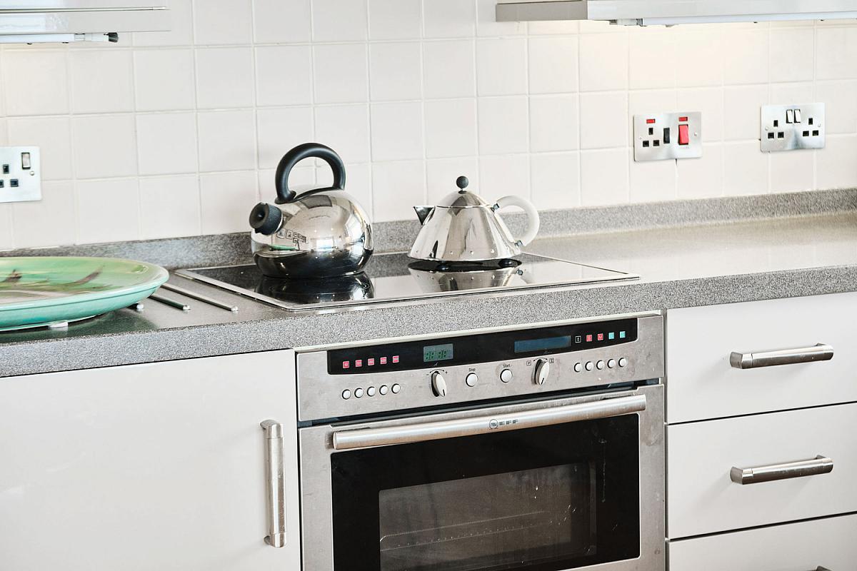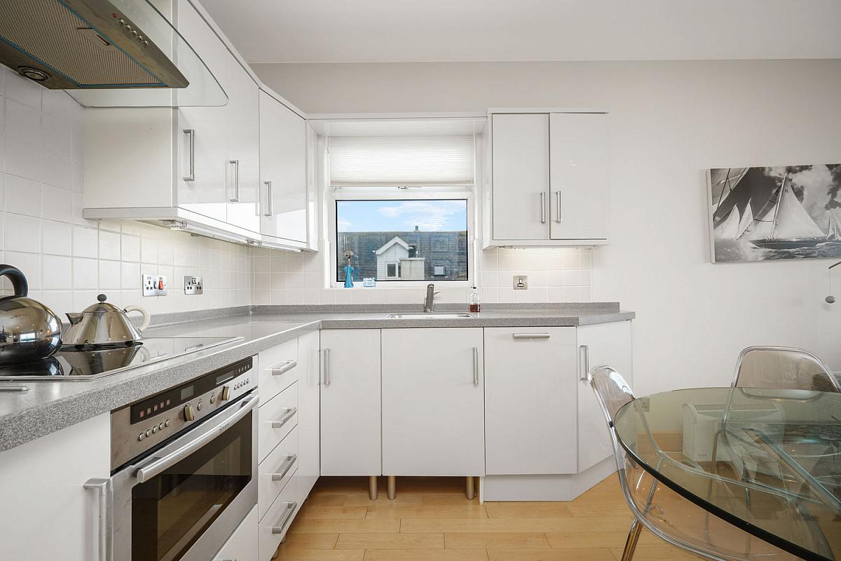 With undermount single drainer stainless steel sink unit, high and low level built in units with tiling between, integrated ceramic hob, integrated oven, stainless steel extractor fan above, integrated fridge, integrated dishwasher, under unit lighting, drawer bank, solid wood floor and sea views across Portballitrae Bay.