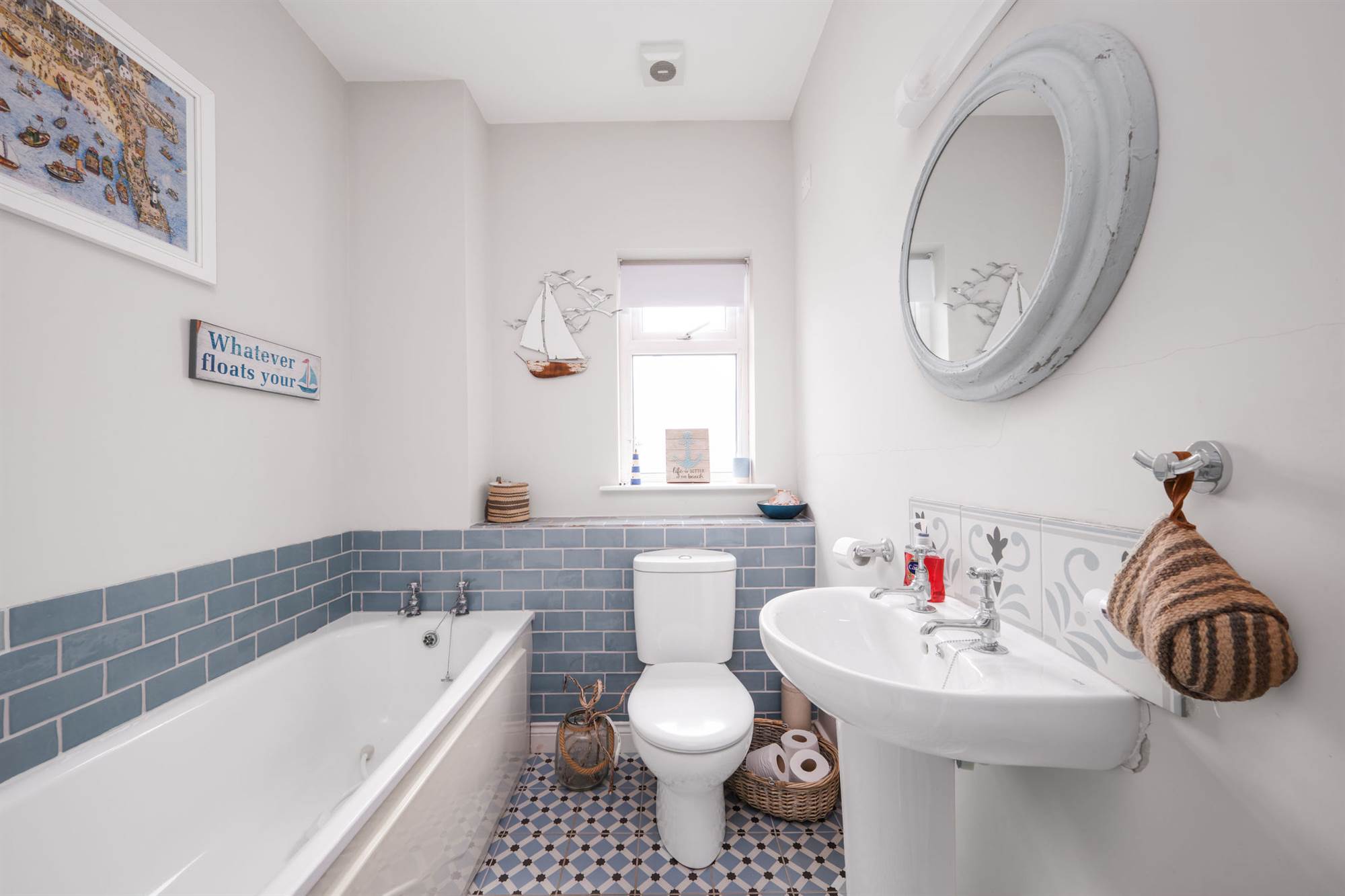 With white suite comprising w.c., wash hand basin with tiled splashback, bath with tiled surround, fully tiled walk in shower cubicle with mains shower, part tiled walls, shaver point and light, recessed lighting, extractor fan and tiled floor.