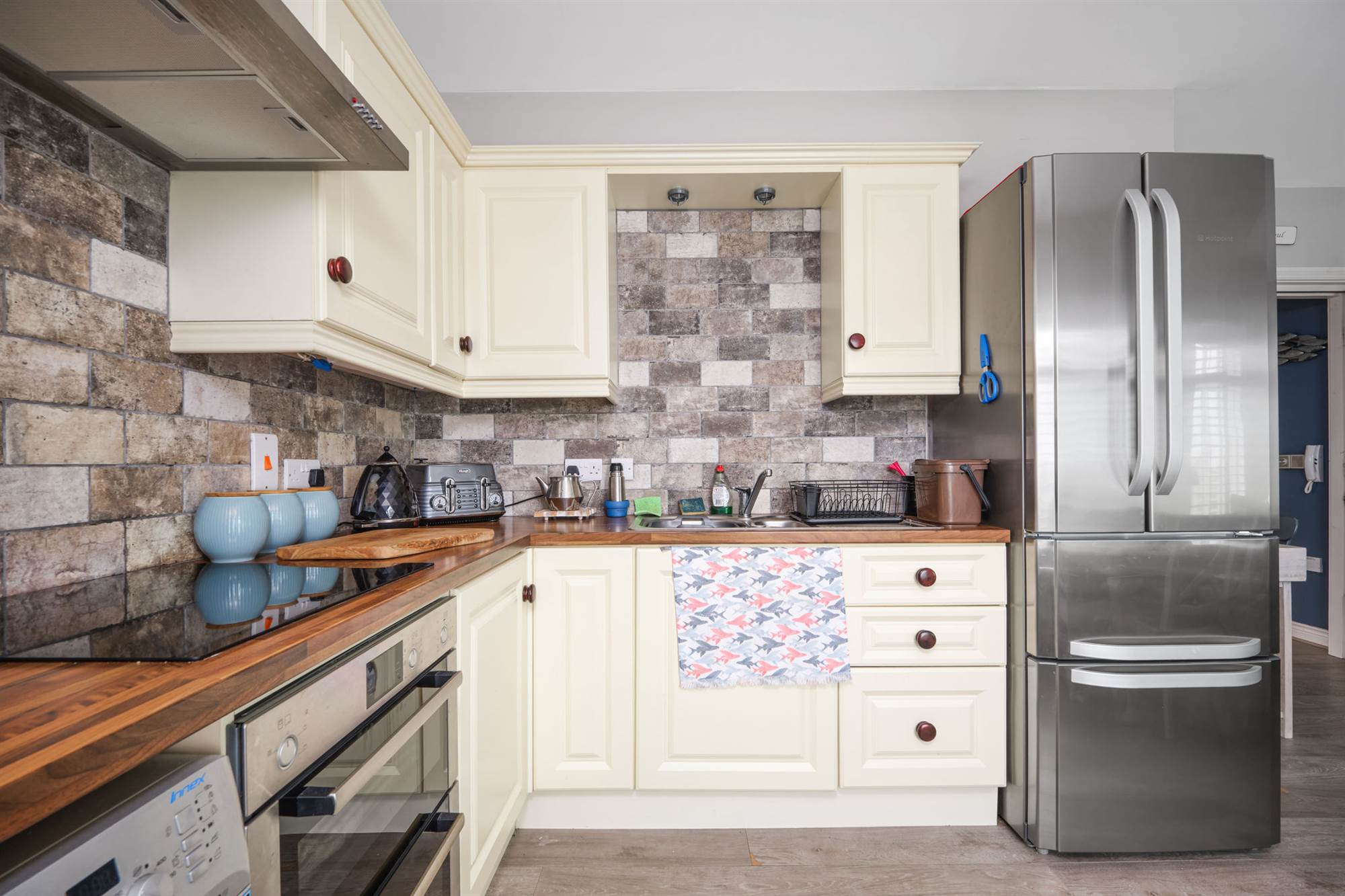 With bowl and half single drainer stainless steel sink unit, high and low level built in units with tiling between, integrated ceramic hob, double eye level oven, stainless steel extractor fan, space for fridge freezer, plumbed for automatic washing machine, dishwasher or tumble dryer, under unit lighting, recessed lighting in pelmets, saucepan drawers, recessed lighting, window shutters, laminate wood floor and sea views.