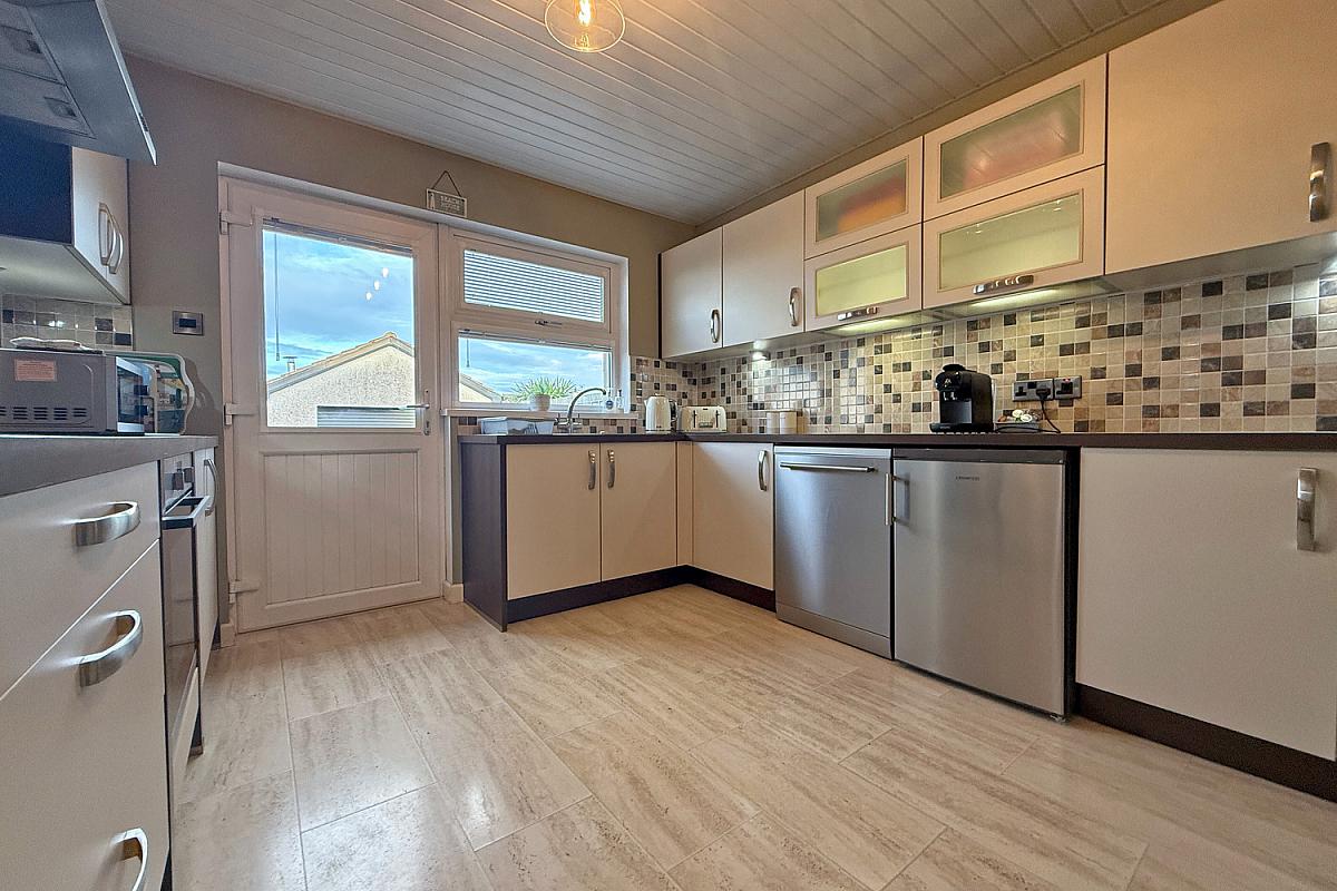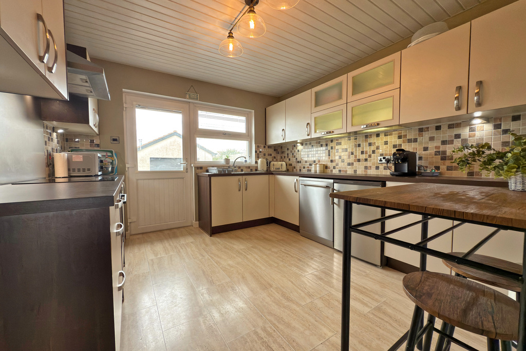 Range of fitted units; laminate work surfaces; stainless steel sink & drainer; electric oven & hob with extractor over; plumbed for dishwasher; space for under counter fridge; door to the rear.